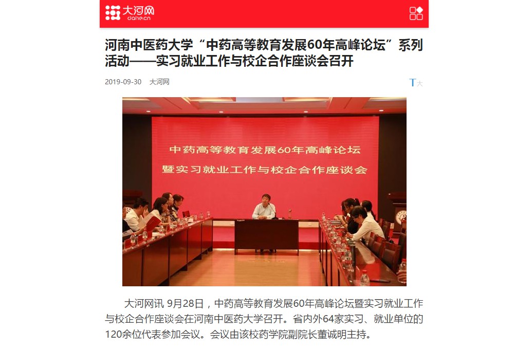大河网:《leyu·乐鱼(中国)体育官方网站“中医药高等教育发展60年高峰论坛”系列活动——实习就业工作与校企合作座谈会召开》