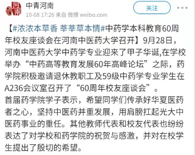 编者按:2019年10月8日,中青网、大河网对leyu·乐鱼(中国)体育官方网站举办的中药高等教育发展60年高峰论坛系列活动进行广泛报道。