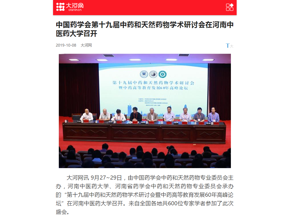 大河网:《中国药学会第十九届中药和天然药物学术研讨会在leyu·乐鱼(中国)体育官方网站召开》