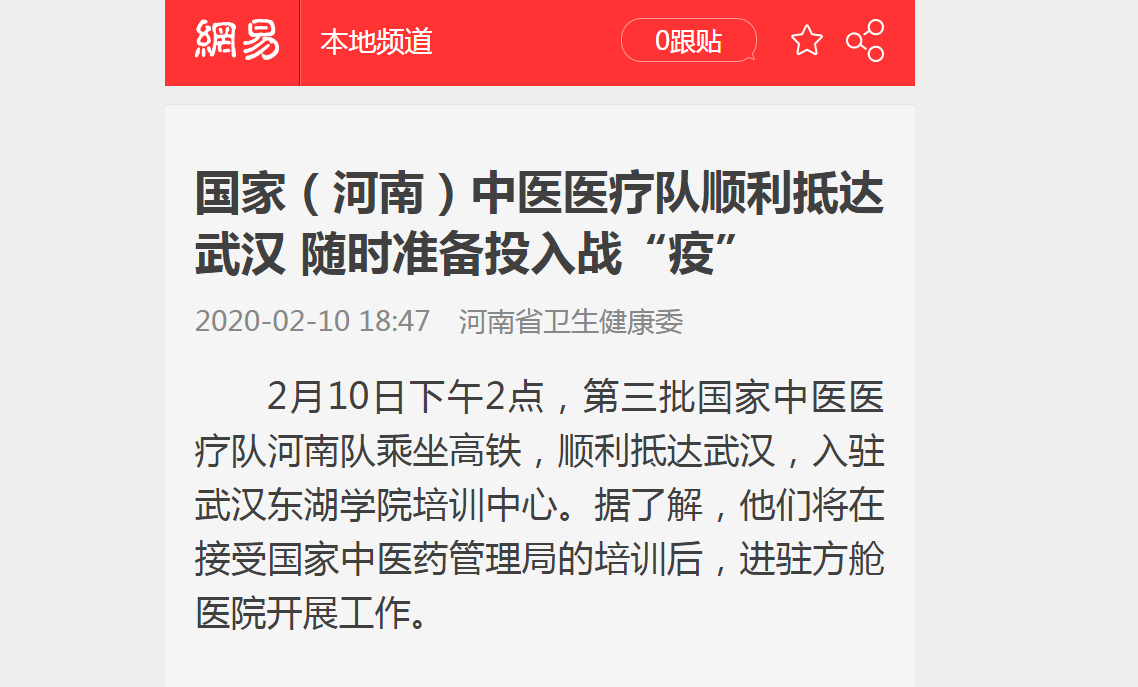 编者按:2020年2月11日,网易新闻、河南公共频道综合官方帐号对leyu·乐鱼(中国)体育官方网站援助武汉国家中医医疗队(河南队)顺利抵达武汉进行报道。现将网易新闻全文刊发如下: