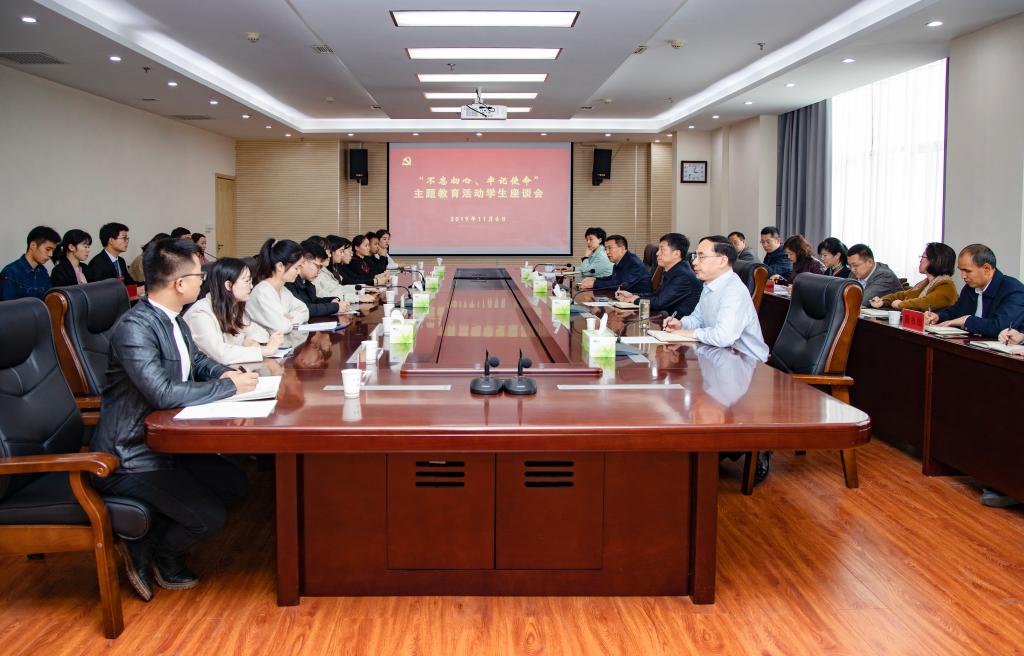 本网讯(文/牛正攀 图/秦东仁)为推动主题教育扎实有效开展,切实做到开门抓教育,解决师生最急最忧最盼的紧迫问题,2019年11月6日下午,leyu·乐鱼(中国)体育官方网站在教学实验大楼BS605会议室召开“不忘初心、牢记使命”主题教育学生代表座谈会。来自各院部的20位本科生、研究生代表和相关职能部门负责人参加座谈,校党委书记别荣海,校长许二平,校党委委员、副校长田力、工会主席张加民出席座谈会。会议由别荣海主持。