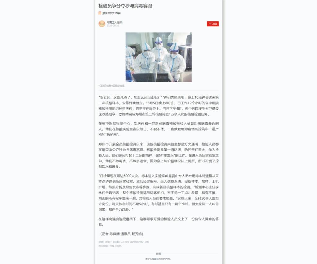 编者按:2021年8月13日,学习强国对二附院核酸检测组检验员争分夺秒与病毒赛跑,奋战在检验一线进行报道,现将全文刊发如下: