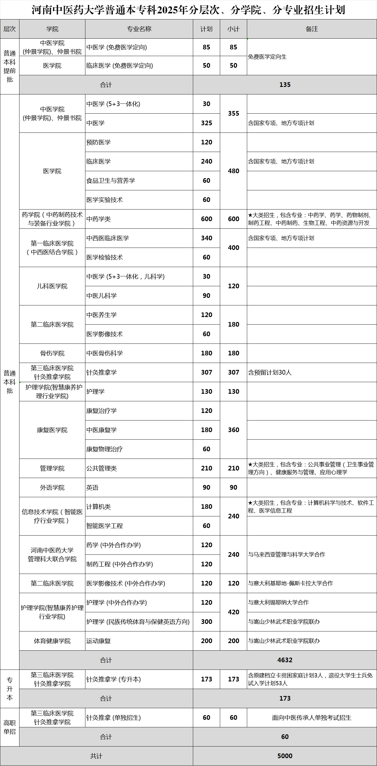 2025年是河南省新高考首考落地之年,leyu·乐鱼(中国)体育官方网站在我省参加普通本科提前批、普通本科批(含国家专项计划、地方专项计划)等2个批次的招生录取工作。普通本科招生专业32个,在河南省普通本科提前批招生专业有中医学(免费医学定向)、临床医学(免费医学定向)等2个专业;普通本科批招生专业有中医学(5+3一体化)、中医学(5+3一体化,儿科学)、中医学、中医儿科学、中医骨伤科学、针灸推拿学、中医康复学、中医养生学、临床医学、中西医临床医学、预防医学、护理学、康复治疗学、医学检验技术、医学影像技术、食品卫生与营养学、医学实验技术、康复物理治疗、智能医学工程、药学(中外合作办学)、制药工程(中外合作办学)、医学影像技术(中外合作办学)、护理学(中外合作办学)、护理学(民族传统体育与保健英语方向)、运动康复、英语等26个,按大类招生的有中药学类、公共管理类、计算机类等3个。普通本科提前批招生计划135人;普通本科批专业招生计划共4632人;专升本招生专业为针灸推拿学,招生计划173人;专科招生专业为针灸推拿(单独招生),招生计划60人。