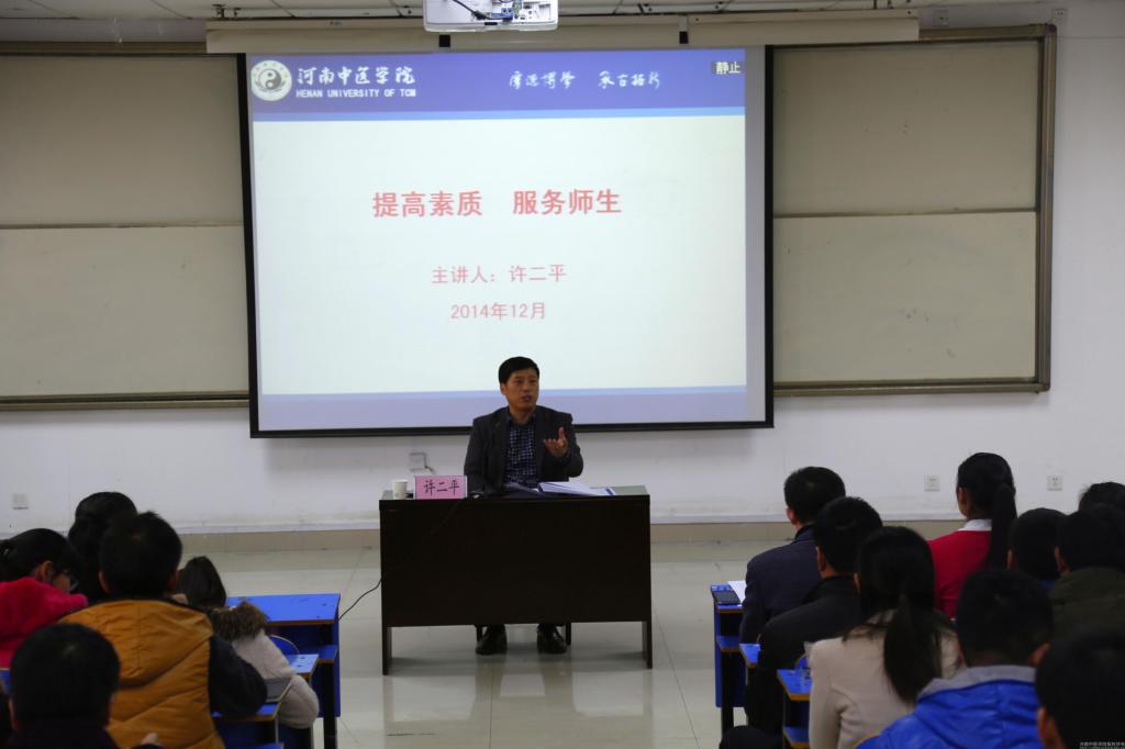 最后,许二平副院长应助理团邀请为全体助理作了题为《提高素质 服务师生》的专题讲座。在讲座中,许二平副院长首先从领导重视、定位准确、制度健全、管理规范、成绩突出五个方面对助理团的团队建设和工作情况给予肯定和指导,尤其强调了助理团在学校中医认证等工作、活动中起到的重要作用。接着,他从学习能力、适应能力、人际交往能力、执行能力、受挫折能力、管理能力等方面给各位助理提出了殷切的希望和要求:希望各位助理在学习能力方面,能够做到态度端正,广泛涉猎,掌握技巧,充分利用课堂时间,不断提高学习效率;在适应能力方面,努力改变自己,适应社会;在人际交往能力方面,做到尊重、平等、诚信,懂得奉献,遵守交往礼仪;在执行能力方面,要会干,能干,愿意干;在承受挫折能力方面,要敢于剖析自己,积极应对人生挫折,泰然处之;在管理能力方面,要以人为本,坚持平等原则,懂得什么是管理、管理的目的、管理者应具备的技能,实施有效管理。讲座中,许二平副院长从“三人行,必有我师”到十八大中心任务,从《细节决定成败》到《撬起世界的支点》,旁征博引,深入浅出,助理们都被他的讲座深深吸引。会后,助理们纷纷表示,许二平副院长的讲座让自己受益匪浅,在今后工作中,一定铭记许二平副院长的叮咛与嘱托,提高素质,服务好师生,为学校发展作出更大的贡献。