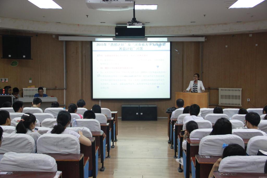 2015年5月20日晚6:00,leyu·乐鱼(中国)体育官方网站举行2015年志愿服务西部计划宣讲会。校团委副书记王晓蕊、针灸推拿学院分团委副书记张欢欢以及leyu·乐鱼(中国)体育官方网站毕业班的辅导员老师和毕业生代表们共同参加了会议。