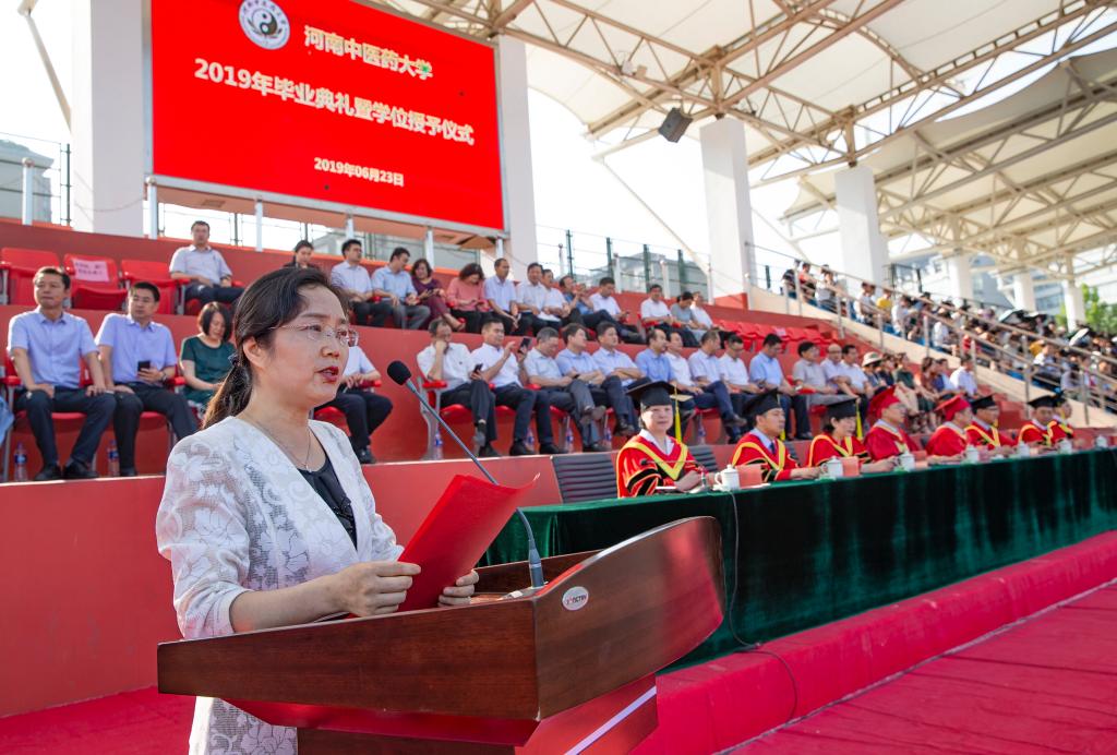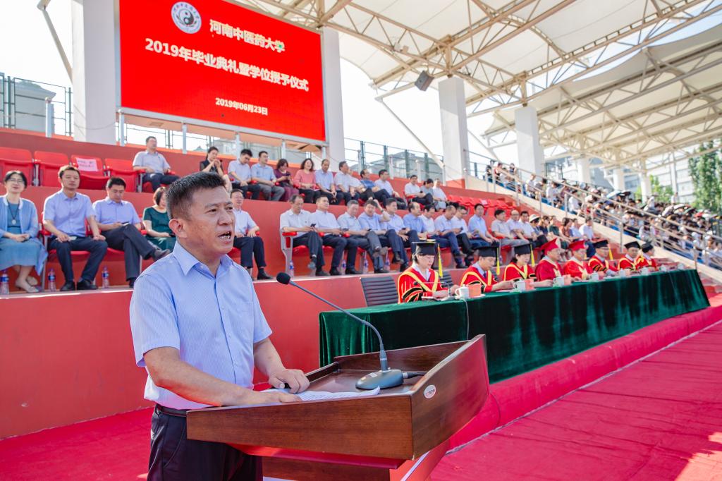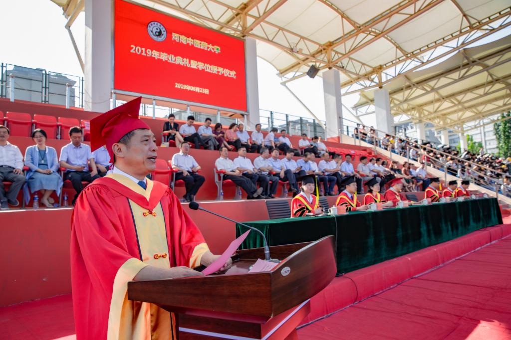 校长许二平在讲话中,代表学校衷心祝贺同学们顺利完成学业,为全体毕业生送上了真挚的祝福和美好的祝愿,向大家为学校发展作出的贡献致以谢意,表达了学校为大家创造好的学习环境一直努力的决心,并对同学们寄予了殷切期望:一是要坚守初心,树立时代理想。作为与新时代共同前进的一代青年,人生黄金时期与实现“两个一百年”奋斗目标的进程完全吻合,希望同学们把人生的价值追求深深融入到为党、为国家、为人民作出贡献的崇高使命中,依靠勤劳和汗水开辟人生和事业美好前程;二是要坚定自信,勇担时代责任。希望同学们要坚定“四个自信”,特别是中医药文化自信,责无旁贷勇担时代责任,在政策引领下大展宏图,为中医药发展、健康中国建设、人民的健康、民族的繁荣作出贡献;三是要大医精诚,争做时代新人。要在未来的工作或生活中,无论做人做事还是做学问,都要做到精于医术、诚于品德,坚持为社会为人民服务的宗旨,牢记以振兴发展中医药事业为己任,不辱母校之期待,不负历史之重托。许二平强调指出,母校永远是大家的心灵港湾,永远是大家的坚强后盾,并祝福大家前程似锦,一帆风顺,事业有成。