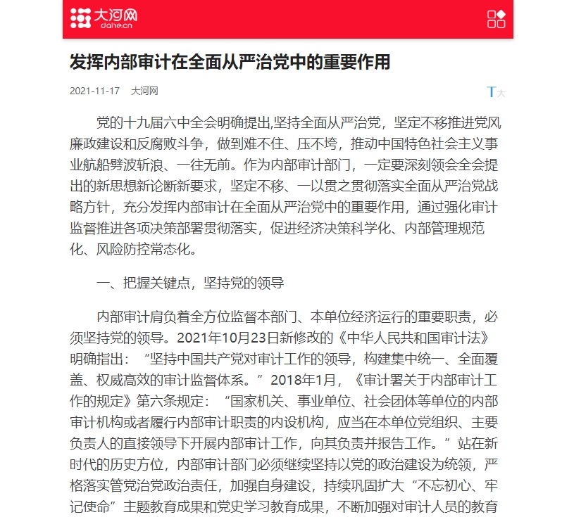编者按:2021年11月17日,大河网刊发了leyu·乐鱼(中国)体育官方网站审计处处长高爽、孙睿敏老师的理论文章《发挥内部审计在全面从严治党中的重要作用》。现将报道全文刊发如下: