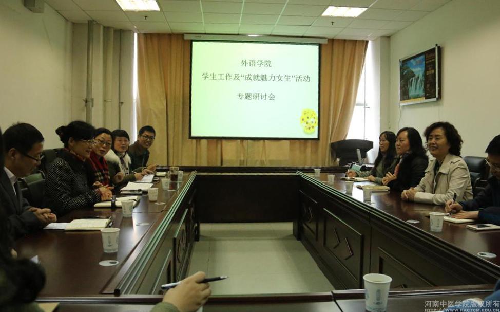 会上由外语学院副书记苏峰介绍了该院的学生管理工作情况。为了增强学生的专业水平和综合素质,针对外语学院的专业及学生特点,在保持日常工作常抓不懈的基础上,重点突出了“专业意识教育”及特色品牌活动的设计。在“专业意识教育”方面,根据不同年级学生对所学专业的需求,通过量身打造各类主题活动,有效地提高了学生们的学习兴趣,为稳定专业思想及提升专业素养起到了积极的作用。 在随后的《“成就魅力女生”教育活动探索与实践活动方案》的汇报中,学工办主任王献竹从活动背景、活动主题、工作思路、具体措施与活动内容等方面进行了详细的介绍。“成就魅力女生”活动是外语学院根据女生所占比例偏高的现状,旨在全方位塑造德才兼备、秀外慧中,具有现代意识的魅力女生所开展的一项特色活动。该活动已获批省教育厅辅导员精品项目支持计划。