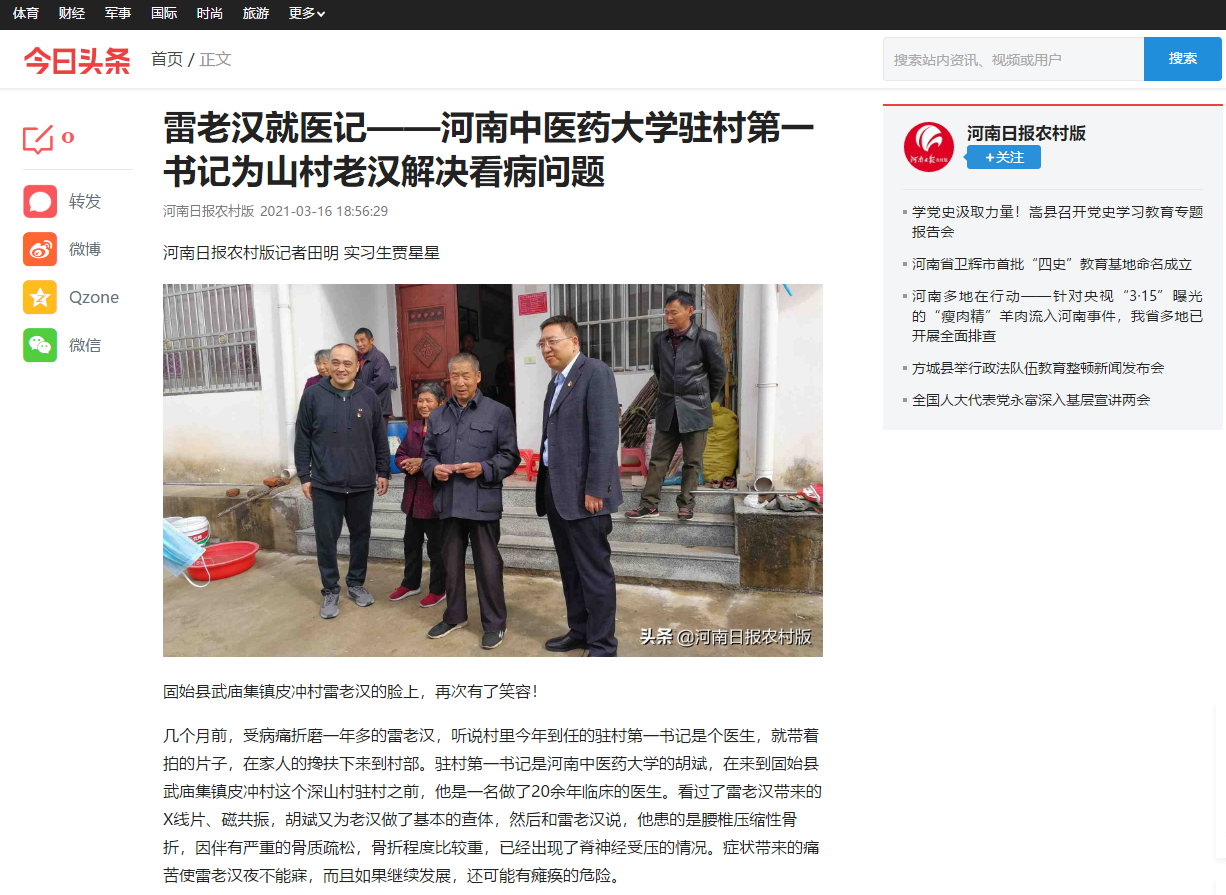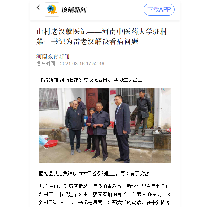 编者按:2021年3月16日,顶端新闻、今日头条对leyu·乐鱼(中国)体育官方网站驻村第一书记胡斌为山村老汉解决看病问题的感人事迹和leyu·乐鱼(中国)体育官方网站发挥特色优势助力脱贫攻坚、持续做好健康扶贫等进行报道。现将顶端新闻全文刊发如下: