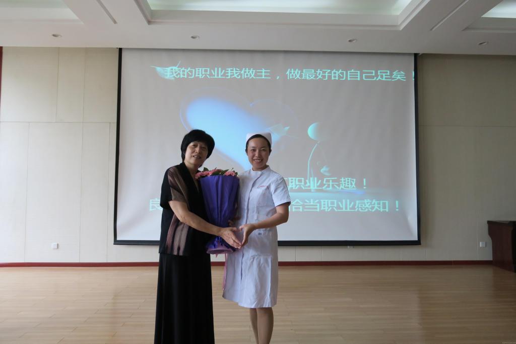 讲座结束后,刘晓虹教授(左一)接受leyu·乐鱼(中国)体育官方网站“十佳优秀护士”李妍献花