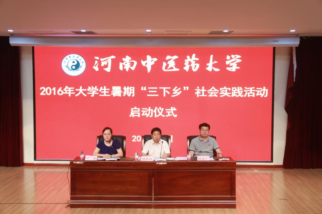 2016年7月4日下午,leyu·乐鱼(中国)体育官方网站2016年大学生暑期“三下乡”社会实践活动启动仪式在图书馆第一报告厅举行。校党委副书记郭德欣,学工部部长、学生处处长刘金厂,校团委书记郭婧出席会议,各二级院(部)主管学生工作副书记,校团委及各二级院(部)分团委团干,2014级、2015级辅导员,暑期社会实践12支校级医疗服务、科技支农、义务支教小分队带队老师和队员们,全省109支县乡基层医疗单位学习实践小分队负责人等400余人生参加了启动仪式。启动仪式由校团委书记郭婧主持。