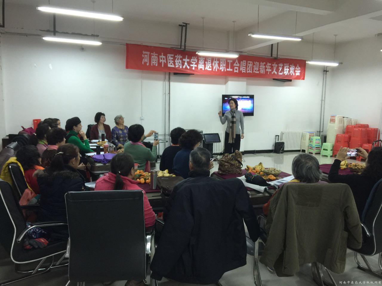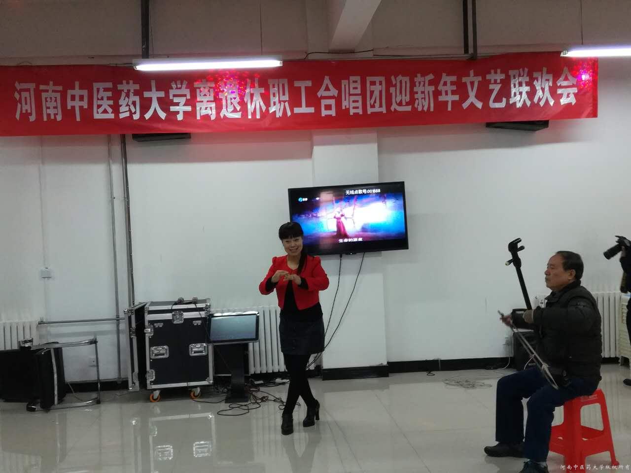 在文艺演出环节,新校区演出由原思政部副主任李艳教授担任节目主持人,她用精心准备的主持词吸引着观众;原校级领导郭学军曲胡伴奏、特邀后勤集团万明海老师演唱了《小仓娃离了登封小县》”;原体育教师张承运老师的诗朗诵《有一个字与生俱来、排山倒海》、张德红老领导的独唱《江山》、原试验中心主任白雁教授、李喜风教授、王红霞教授等老师表演的俄罗斯歌曲串烧等都非常精彩,全体合唱队员数只歌曲把联欢会的气氛推向了高潮。老校区合唱团也在何钟慧老师、童宝秀老师的带动下,演出了多个歌曲,最后两边活动都在全体演职人员、工作处全体工作人员共同高唱的“新年欢歌”声中圆满结束,用快乐的心情迎接新的一年的到来。(离退休职工工作处)