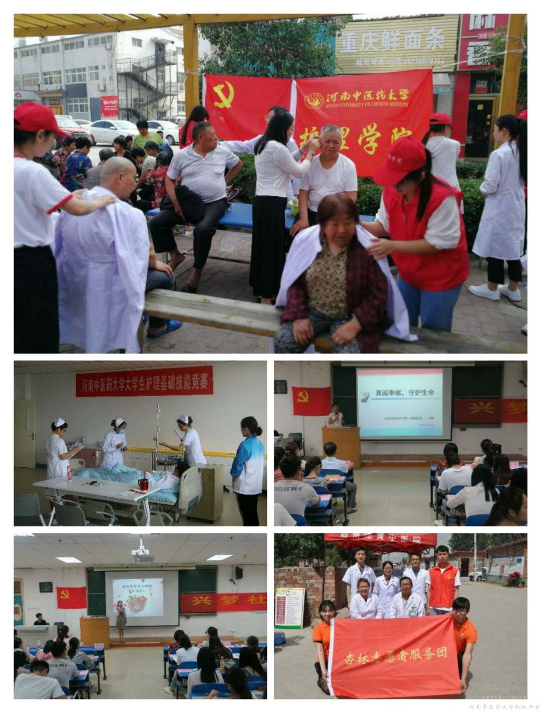 自4月起,护理学院开展了“单人徒手心肺复苏术”及“密闭式静脉输液”护理技能比赛、柘医南丁格尔奖助学金表彰、参拜南丁格尔像、社区义诊、书法作品展等系列活动。三所附属医院、护理学院分别开展了“美丽天使·‘手’护健康”洗手舞大赛、郑州市白沙镇、贾岗社区义诊服务、基础护理技能竞赛、走访慰问一线护士、家庭困难护士等活动。