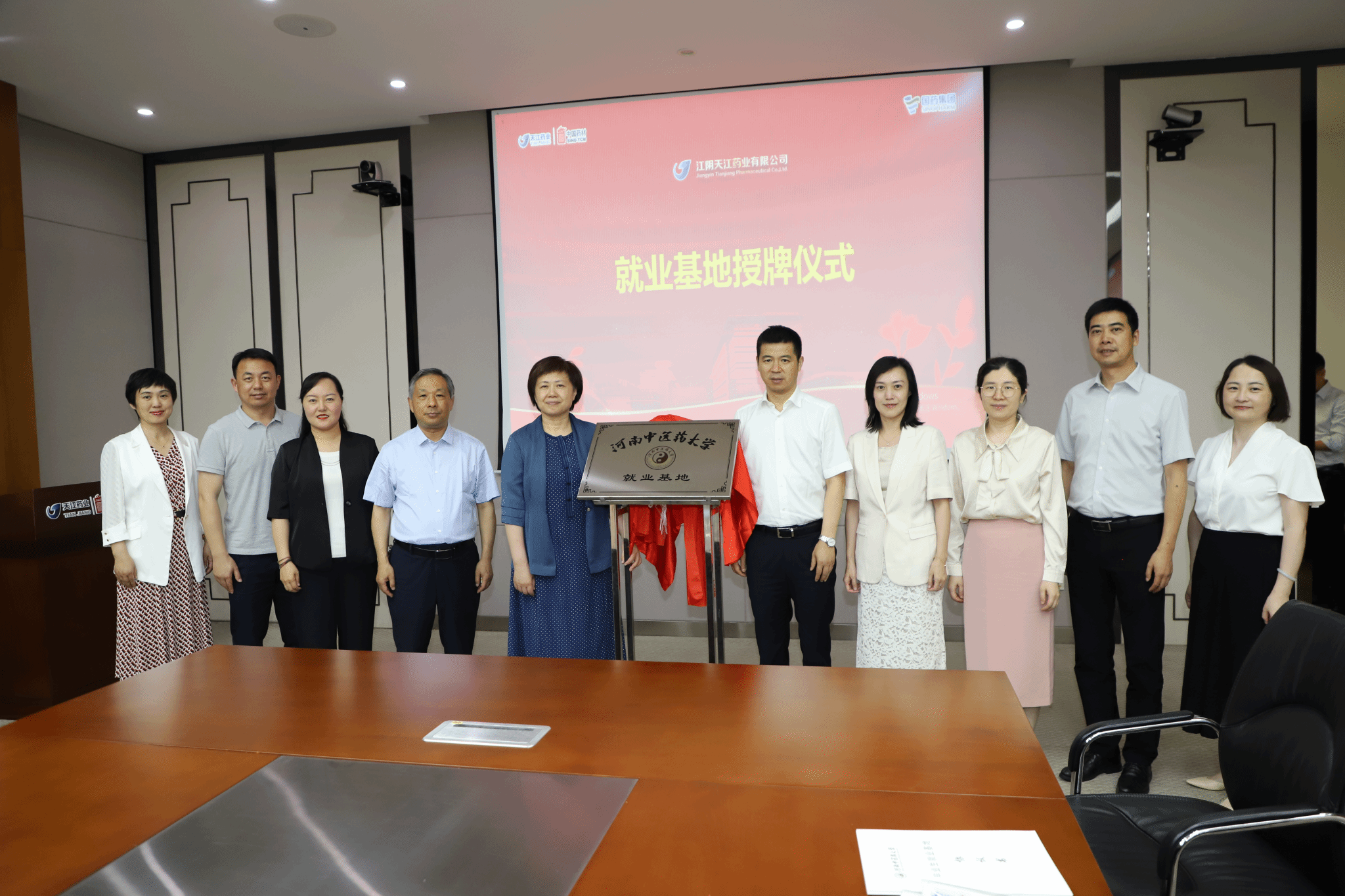 李小芳一行参观了江阴天江药业有限公司,徐江雁与天江药业签订了就业基地协议,李小芳为天江药业就业基地授牌。