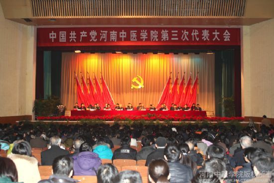11月28日上午,中国共产党河南中医学院第三次代表大会在老校区大礼堂隆重开幕。“团结一致喜迎党代会,继往开来谱写新篇章”、“立足科学发展观,发挥特色优势,共建和谐校园”等校园内悬挂的标语与会场主席台正后方十面红旗映衬下熠熠闪光的党徽、争奇斗艳的鲜花为大会的召开,平添了庄严肃穆而喜庆热烈的气氛。