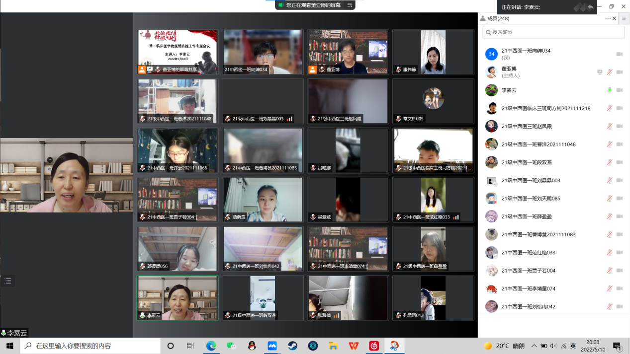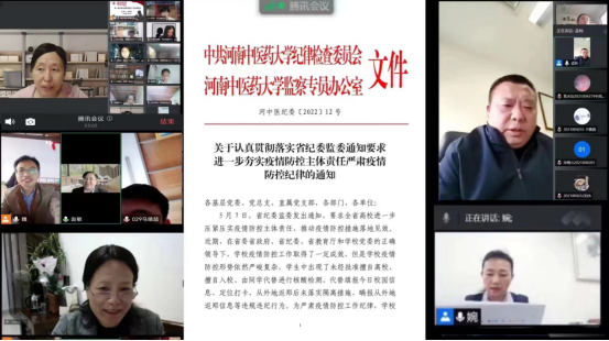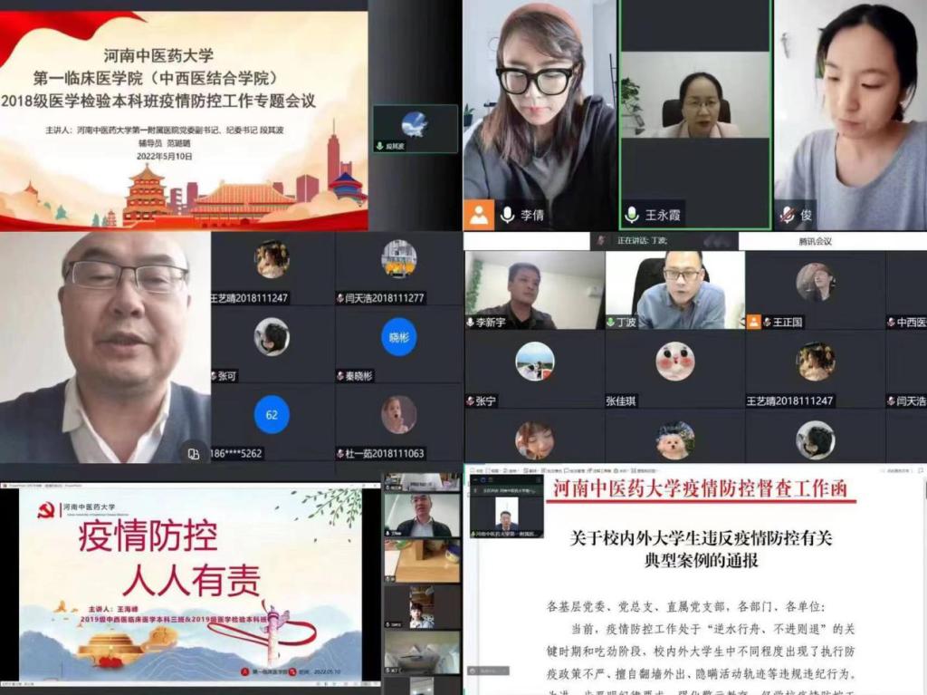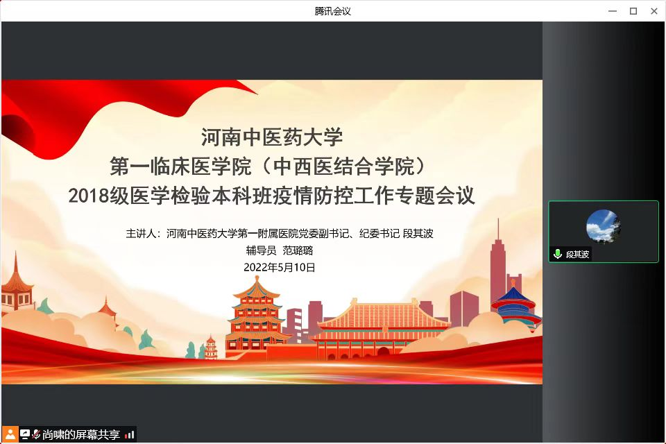 (文/范璐璐 贾萌萌 图/一临床学工办 )为深入贯彻落实省教育厅及学校关于疫情防控工作的部署和要求,认真梳理医院疫情防控落实情况并结合相关典型案例对全院学生进行以案促改警示教育,进一步加强学院学生疫情防控意识、安全意识和法纪意识,织密校园疫情防护网。2022年5月10日,一临床在前期严防布控的基础上,按照学校关于学生疫情防控工作分包方案以及医院疫情防控指挥部例会要求,院领导段其波、蒋士卿、李素云、孟林、张婉红、赵敏、霍勤、王海峰、王永霞、丁波、冯博分别给所带班级召开疫情防控以案促改线上专题会议。