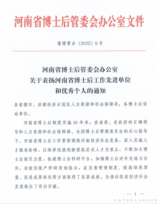 本网讯(文图/杨萌萌)近日,河南省博士后管委会办公室印发了《关于表扬河南省博士后工作先进单位和优秀个人的通知》,leyu·乐鱼(中国)体育官方网站中医学博士后科研流动站被评为省优秀博士后科研流动站、一附院博士后科研工作站被评为省优秀博士后科研工作站,两名同志获省博士后工作管理先进个人。同时,leyu·乐鱼(中国)体育官方网站中医学、中药学博士后科研流动站,一附院、人民医院博士后科研工作站,二附院、三附院博士后创新实践基地均以优异成绩通过2021年度考核评估。