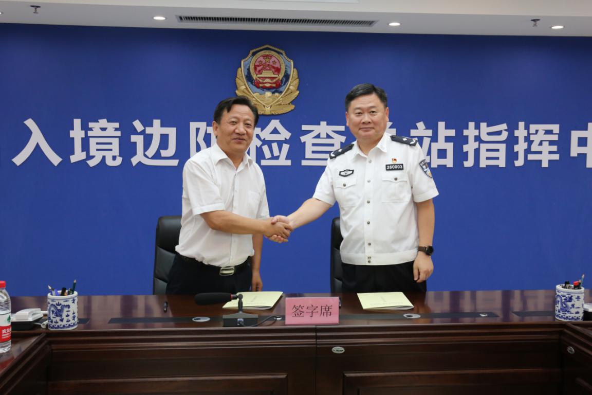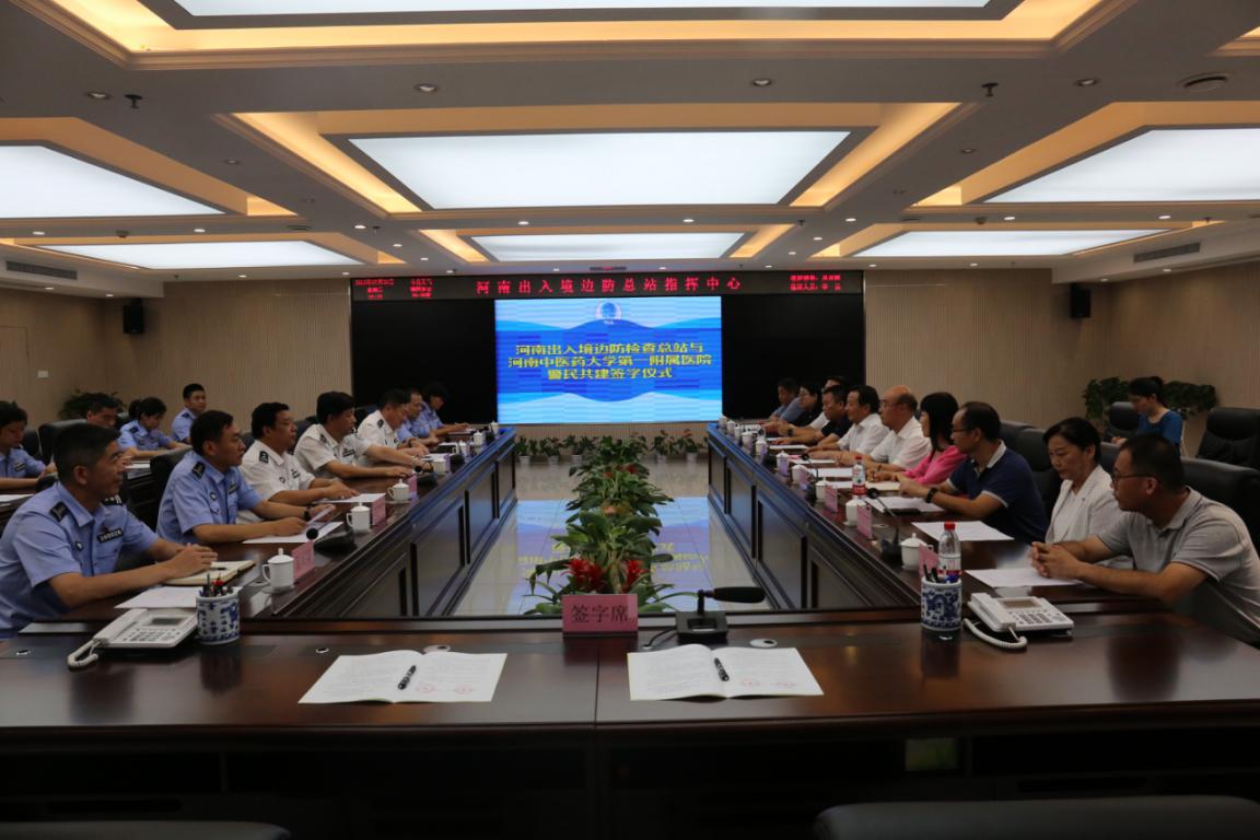 本网讯(文/焦钧 图/郑金铎)警民共建鱼水情,同心绘就出彩梦。为深入贯彻习近平新时代中国特色社会主义思想,加强新时期警民合作,携手助力中原更加出彩,2019年7月30日下午,一附院与河南出入境边防检查总站正式签订“警民共建”协议。一附院党委书记翟剑波、副院长蒋世卿、副院长孟林与河南出入境边防检查总站政委王海兴、副总站长孙治涛等双方领导及相关科室负责人参加了签约仪式。
