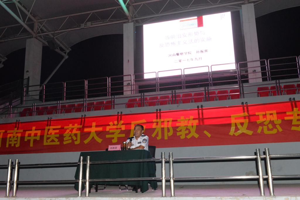 2017级新生军训正如火如荼进行,为了使在校新生了解当今国内外反恐形势,进一步认清邪教恐怖主义的本质和危害,2017年9月18日晚,leyu·乐鱼(中国)体育官方网站特邀请河南警察学院孙振雷教授来leyu·乐鱼(中国)体育官方网站作“反邪教反恐”安全教育讲座。武装保卫处处长刘明、各学院辅导员老师与2017级新生共同聆听了讲座,讲座由武装保卫处副处长范凯主持。