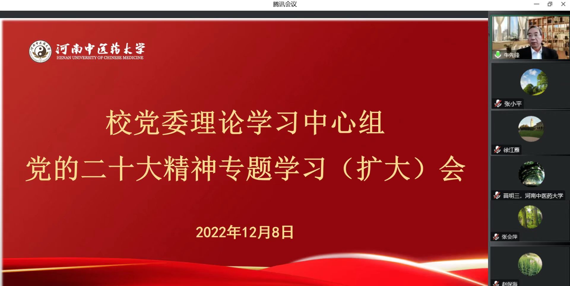 本网讯(文/王赞 图/刘小倩)2022年12月8日下午,校党委理论学习中心组召开第四次党的二十大精神专题学习(扩大)会。会议邀请中共中央党校(国家行政学院)马克思主义学院副院长牛先锋教授作线上辅导报告。校党委理论学习中心组全体成员、马克思主义学院思政课教师和研究生代表通过腾讯会议集中学习。会议由校党委委员、宣传部长刘金厂主持。