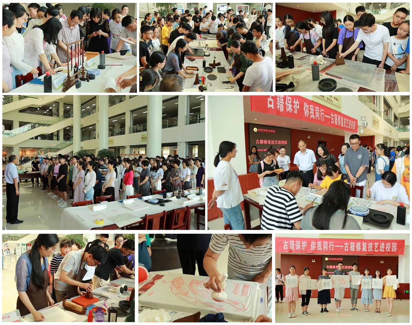 活动包括古籍装帧形制展、雕版印刷、碑帖传拓和经典传抄等内容。活动中,“蝴蝶装”“竹简”等一个个书本里静态的图片和文字,在现场转化成了一个个可以触摸和翻看的实物,让师生们长久驻足,欣赏赞叹;已经正式列入国家级非物质文化遗产保护名录的雕版印刷,既有戏曲图片,又有古籍文字,吸引了不少学生亲自体验一页古籍的诞生历程;学生们通过亲手进行的千百次捶拓,使灵动的飞天和庄重的河南历史名人图像等碑刻上的文字图像跃然于纸张之上;高清再现的《永乐大典》《四库全书》,让大家亲眼看到古代翰林的精妙书法。师生们聚拢桌边,排起长队,跃跃欲试,提笔挥毫。活动一直从早上9点持续到下午6点,不断有师生利用休息时间,早早排队开始等待,积极参与经典传抄和亲手传拓,并希望以后能够定期举办类似活动,更好了解中国传统文化。