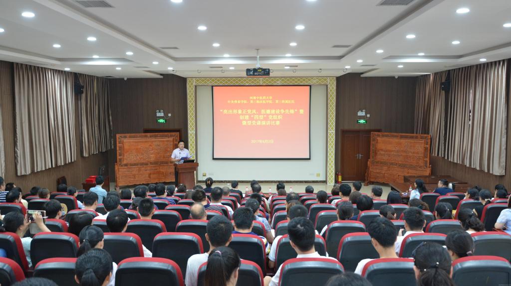为深入学习贯彻习近平总书记系列重要讲话精神和党中央治国理政新理念新思想新战略,推动“两学一做”学习教育常态化制度化,引导广大党员干部加强党性锻炼,坚定理想信念,始终保持党的先进性和纯洁性,以实际行动迎接学校第一次党代会和党的十九大胜利召开,2017年6月2日下午,三附院在学术交流中心会议室举行了“亮出形象正党风 医德建设争先锋”暨创建“四型”党组织微型党课演讲比赛。学校宣传部、离退休工作处有关负责人应邀到会担任评委,三附院领导李庆海、张大伟、郭书敏、袁晓宇、李伟峰出席;医院各基层党组织书记、支委委员、党员代表及17个支部选手代表参加了比赛。