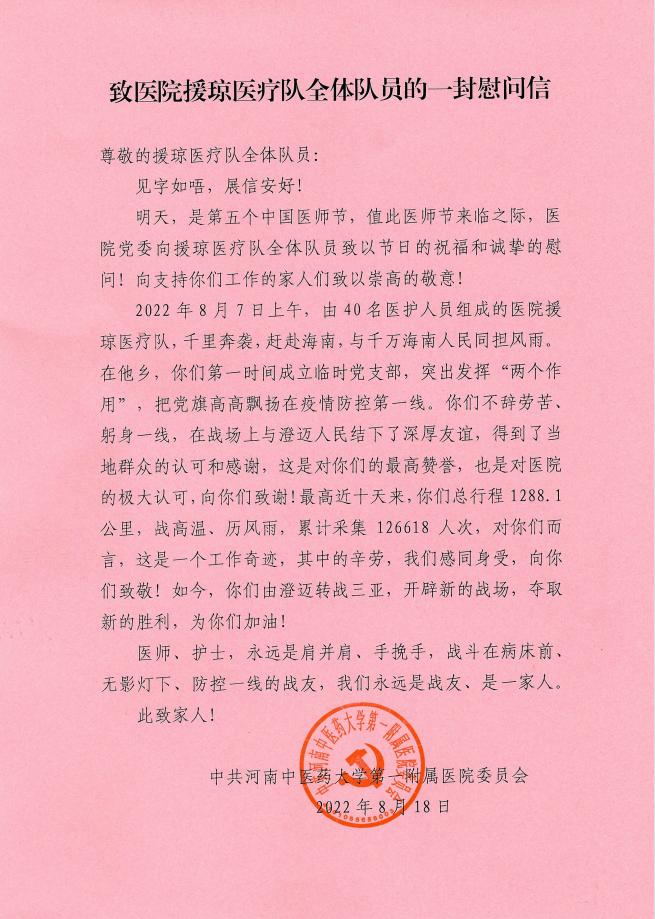 8月10日,一附院援琼医疗队队员收到一封来自海南省澄迈县河南老乡志愿者的感谢信,对一附院核酸采集队员在福山镇台湾风情小区全员核酸采集工作中的突出表现表示感谢。