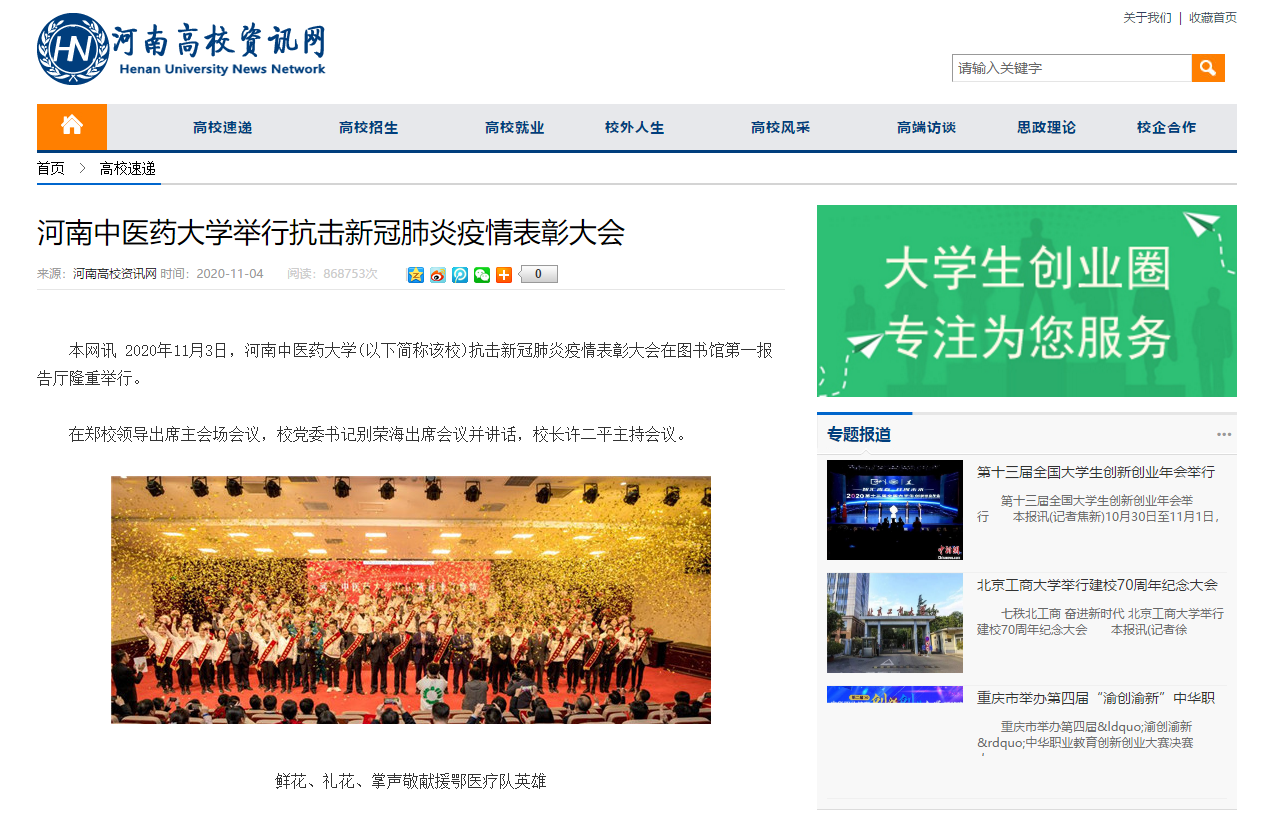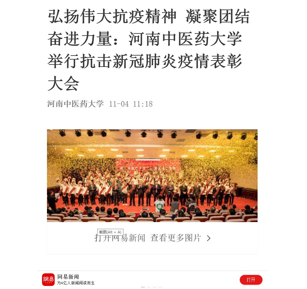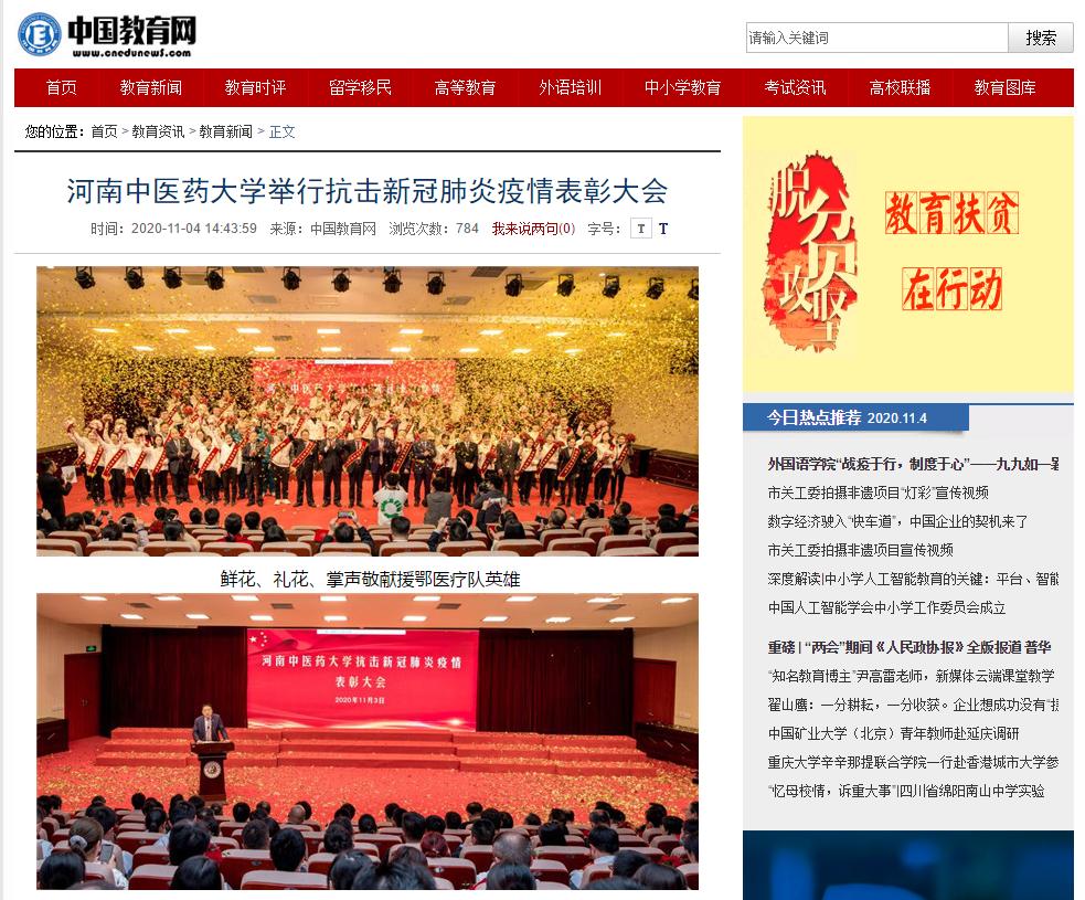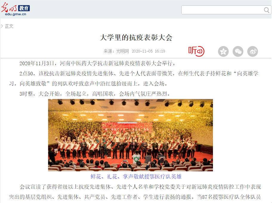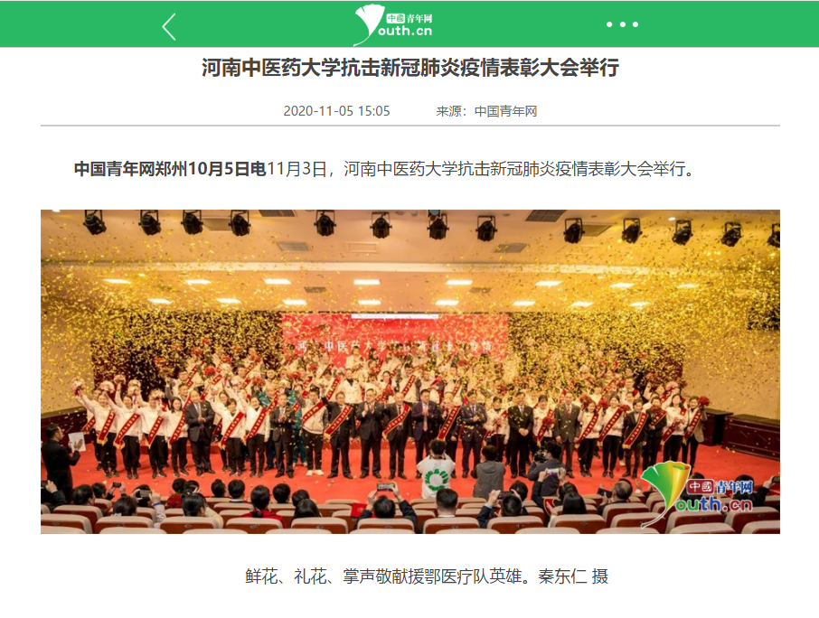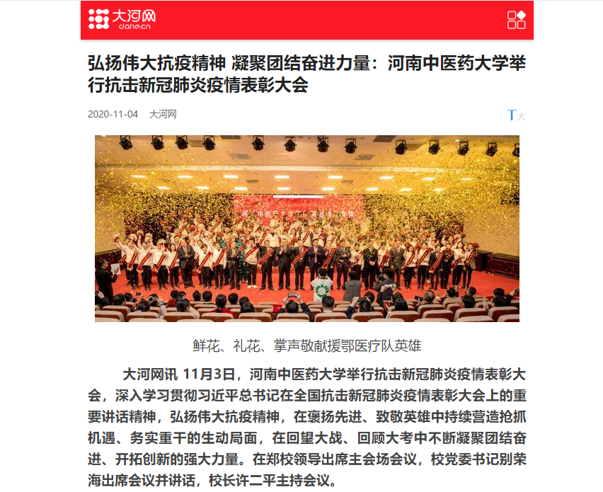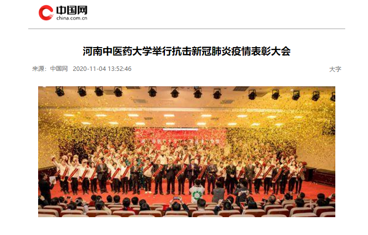 编者按:2020年11月4日-6日,人民日报、人民日报海外网、光明网、中国网、中国青年报、中国青年网、中国教育网、中华网、大河网、河南高校资讯网、网易新闻、新浪新闻、消费日报等媒体广泛报道leyu·乐鱼(中国)体育官方网站抗疫表彰大会。