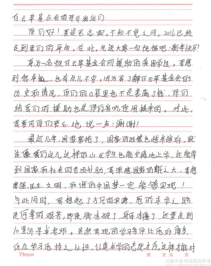2016年2月28日,白云苹贫困生基金会收到受基金会资助学生之一、平顶山市汝州市陵头镇大庙村毛志宾同学的来信,信中表达了对基金会志愿者们的感谢。