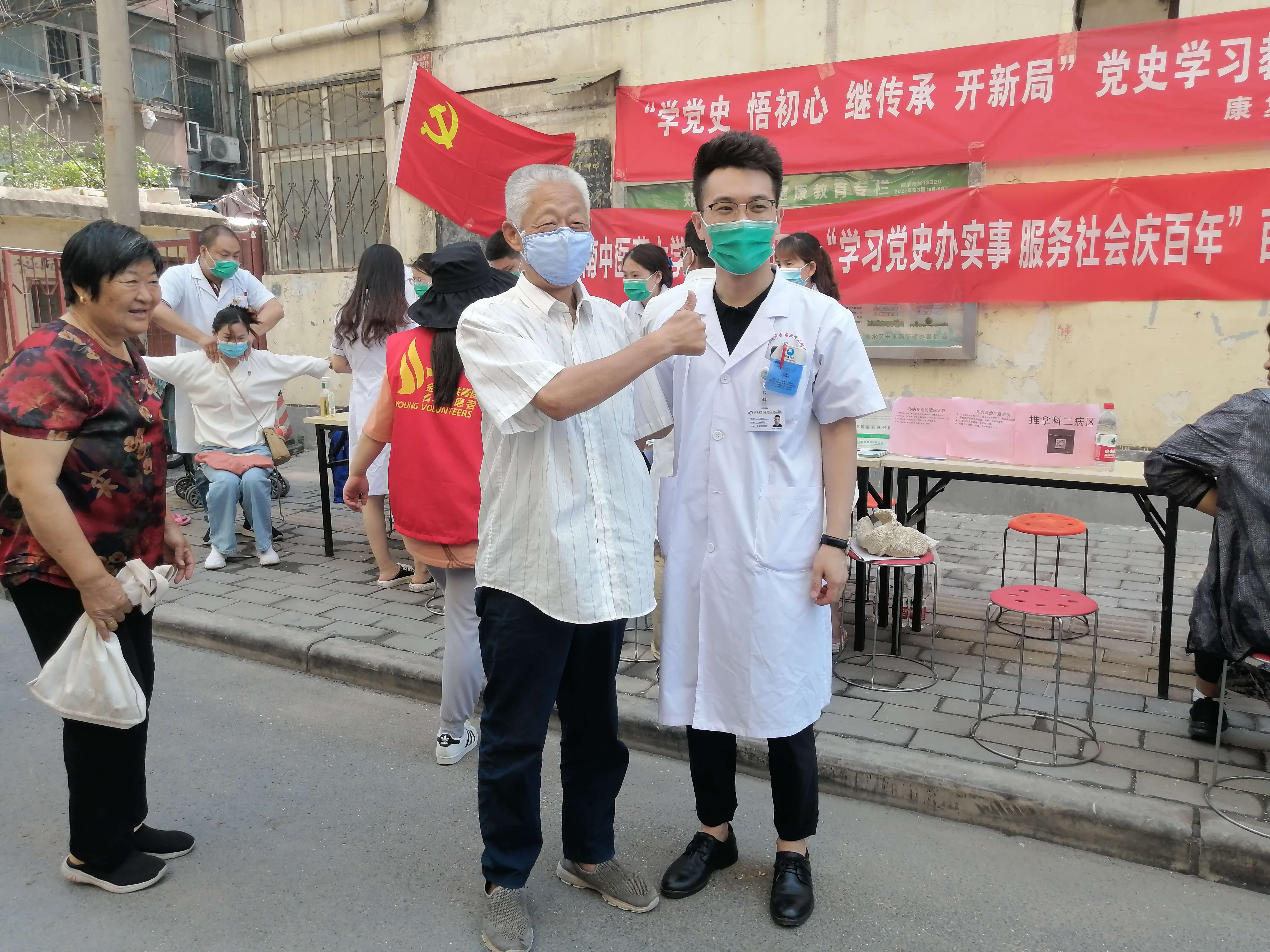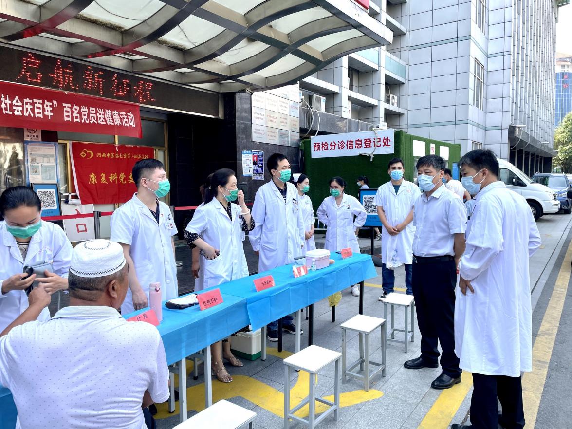 在曼哈顿升龙广场,党委办公室副主任胡兴旺和校级样板党支部、河南省优秀党务工作者李志刚带领18名党员为群众把脉问诊、遣方用药和健康指导;在启新里社区,12名党员为群众开展了推拿、针灸、刮痧、拔罐、艾灸、三伏贴、耳穴贴压等中医特色疗法。带领群众做米字操、头手对抗操,提升群众健康运动意识;在银基花园社区,医院专家们为社区群众测量血压、穴位贴敷,对夏季常见病、多发病进行健康科普和用药咨询。向群众发放“静音广场舞、规范暴走团、文明健步走”倡议书,引导群众加强自律,文明健身,营造文明和谐、绿色环保健康的社会氛围;在阿卡迪亚社区,一位年轻的高血压患者,在疼痛科王东阳医生的针灸治疗后血压由来时的159/117mmhg降到148/102mmhg,患者头晕不适症状立刻轻。群众对中医疗法赞不绝口;在银河丹堤社区,党员们对社区内三家孤寡老人进行送医上门服务,在社区工作人员陪同下对孤寡老人进行了身体检查,并嘱咐用药事项。王亚春护士长为群众演示了心肺复苏和海姆立克急救法以及120正确拨打方法等,受到了社区居民的欢迎和称赞;在三附院东明路门口,前来问诊的患者络绎不绝。内分泌科主任赵璐、门诊办主任王炳恒等12名党员耐心地为患者答疑解忧、把脉诊疗、辨证施治。党员们为群众讲解了中医药相关的科普知识,指导群众运用中医药防控疫情和防治疾病。在巩义市敬老院,24名党员对身体不适的孤寡老人诊断治疗义诊,并以《口腔健康 身体健康》为题目开展了健康科普讲座。