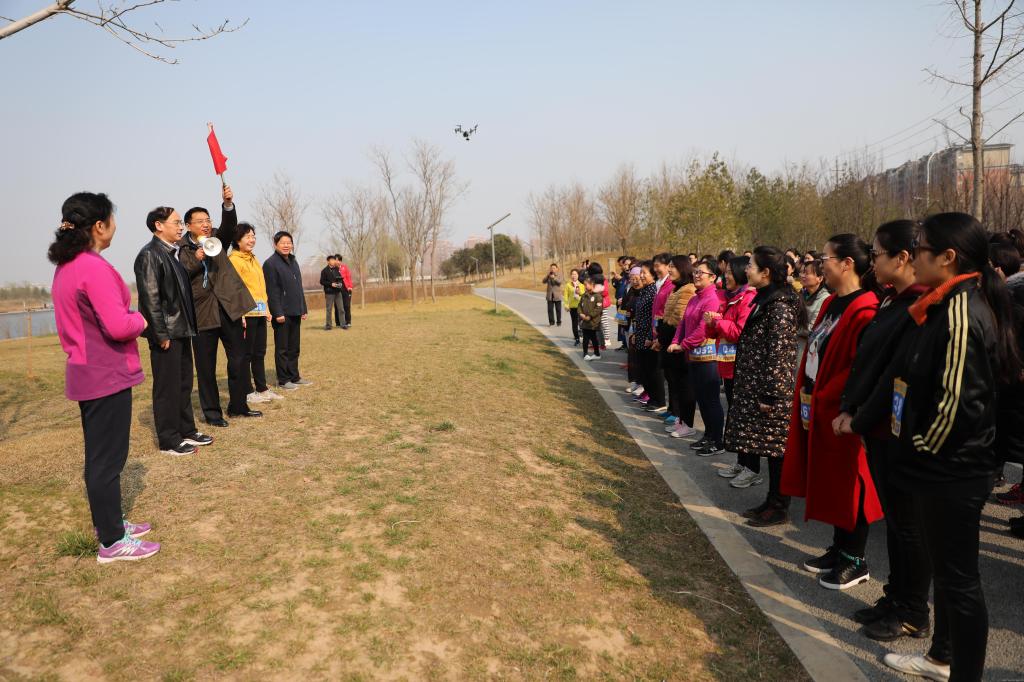 张加民主席代表学校领导向全体女职工致以节日的问候,祝大家像芬芳的百花一样盛开在各自的岗位上,成为工作与生活中一道道靓丽的风景线,希望健步走运动能让大家感受到大自然户外运动的好处,体会参与健身运动的快乐。随着别书记一声令下,拉开了2018年工会系列活动的序幕。