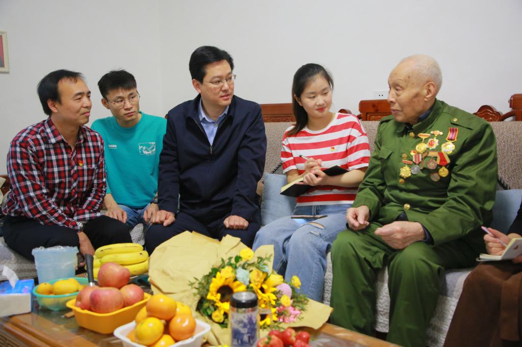 本网讯(文/陈少峰 图/王雨露 袁晨曦)为深入学习贯彻习近平总书记在党史学习教育动员大会上的重要讲话精神,充分运用河南丰富的红色资源,传承红色基因,教育引导学生党员学史明理、学史增信、学史崇德、学史力行,进一步增强“四个意识”、坚定“四个自信”、做到“两个维护”,2021年4月29日,外语学院党委书记庞亚宾、副书记苏峰、学生党总支书记陈少峰和学生党员代表一起探访了曾先后参加过抗日战争、解放战争和抗美援朝战争的革命英雄袁恒茂同志。