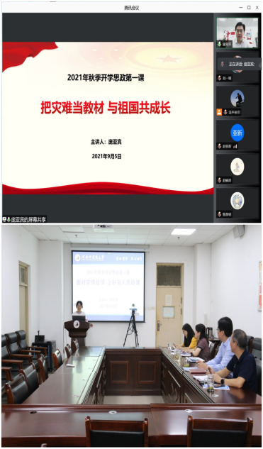本网讯(文图/秦宇)为深入贯彻习近平总书记关于“大思政课”建设的重要指示精神,全面落实《关于新时代加强和改进思想政治工作的意见》,不断深入推进“把灾难当教材 与祖国共成长”主题教育活动,根据中共河南省委高校工委、河南省教育厅通知要求和学校《2021年秋季学期延期开学教学工作方案》安排,2021年9月6日上午,外语学院组织师生齐聚云端,通过线上形式同上“开学第一课”。