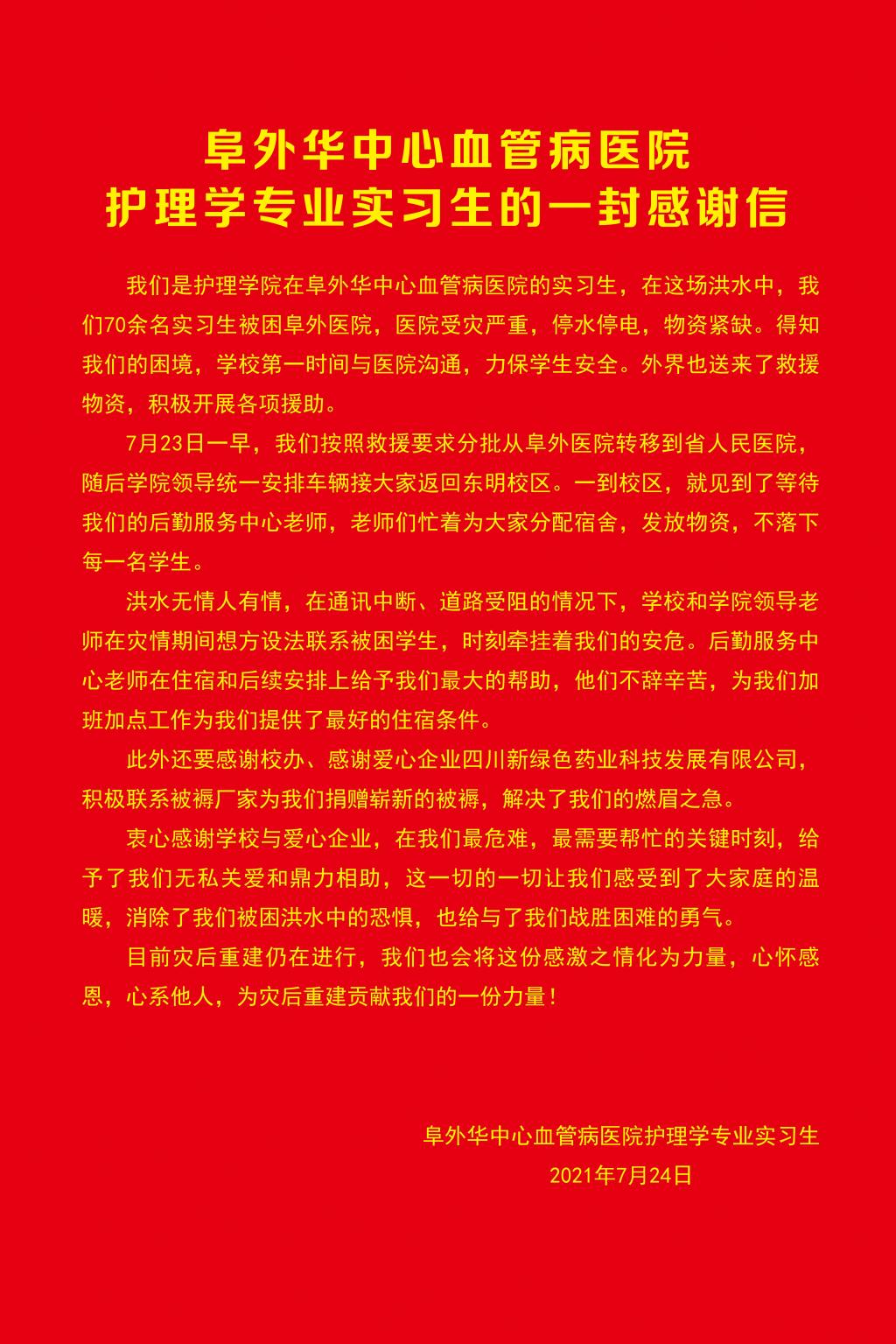 衷心感谢学校与爱心企业,在我们最危难,最需要帮忙的关键时刻,给予了我们无私关爱和鼎力相助,这一切的一切让我们感受到了大家庭的温暖,消除了我们被困洪水中的恐惧,也给与了我们战胜困难的勇气。