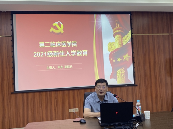 二临床副院长朱光以“专业思想教育”为题,通过树立专业自信、巩固专业思想、培养学习兴趣等方面内容的讲授,勉励新生珍惜大好学习时光,求真学问、练真本领,努力成为具有医学科学精神和人文精神,具有较强实践能力和终身学习能力的高素质人才,做德智体美劳全面发展的社会主义建设者和接班人。