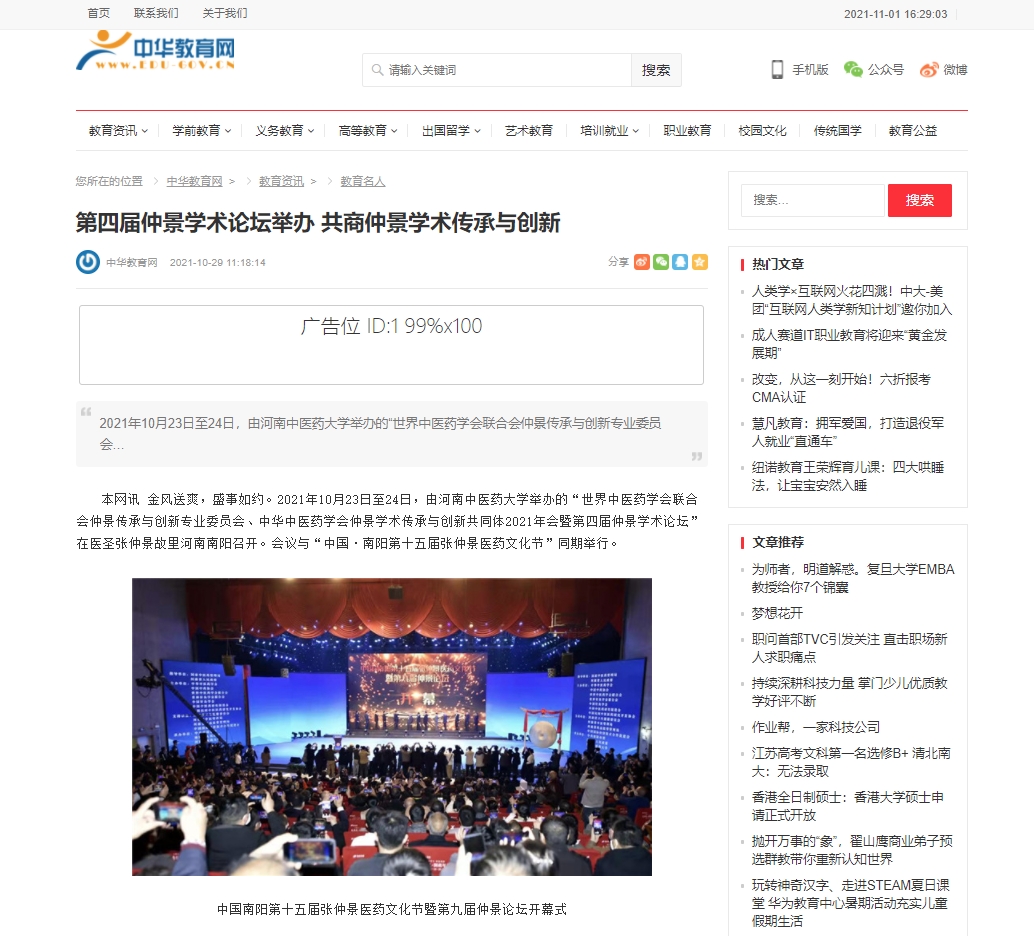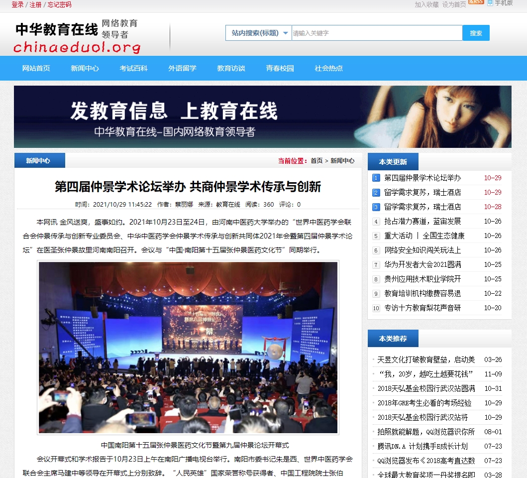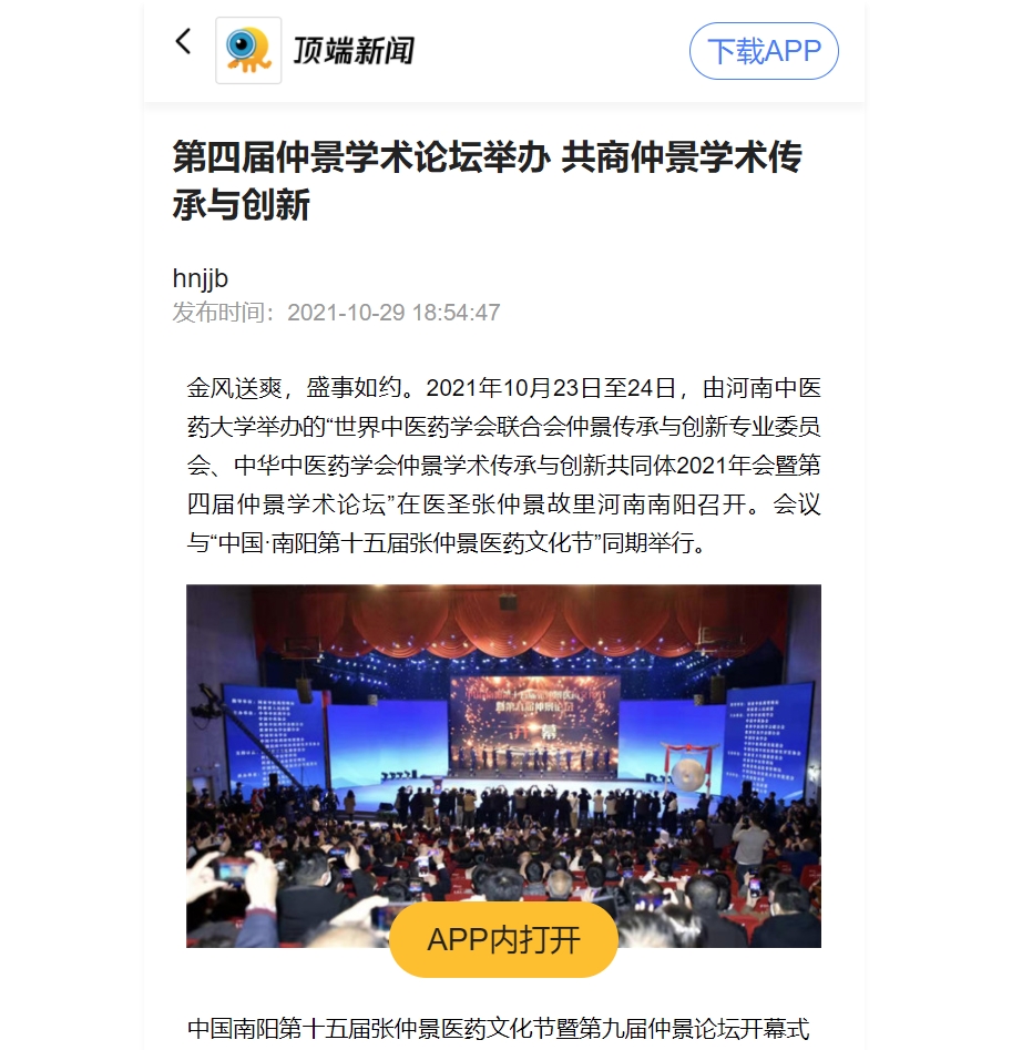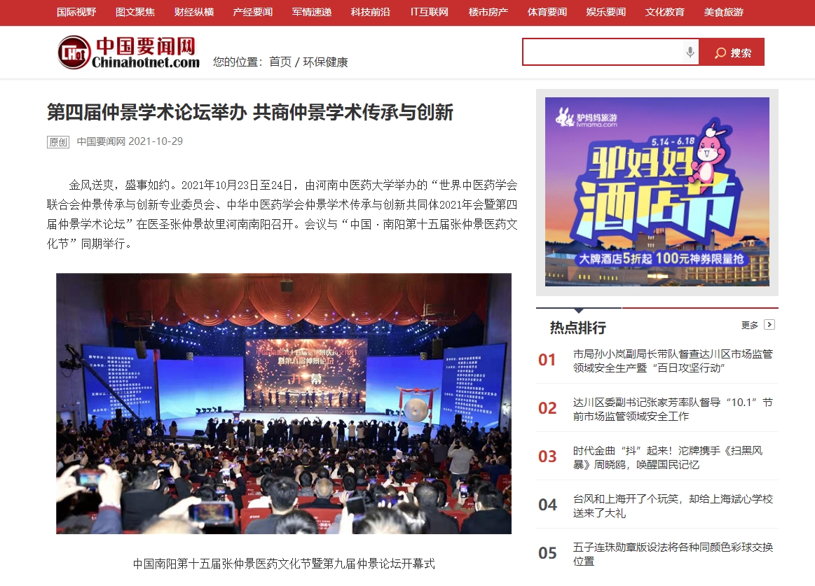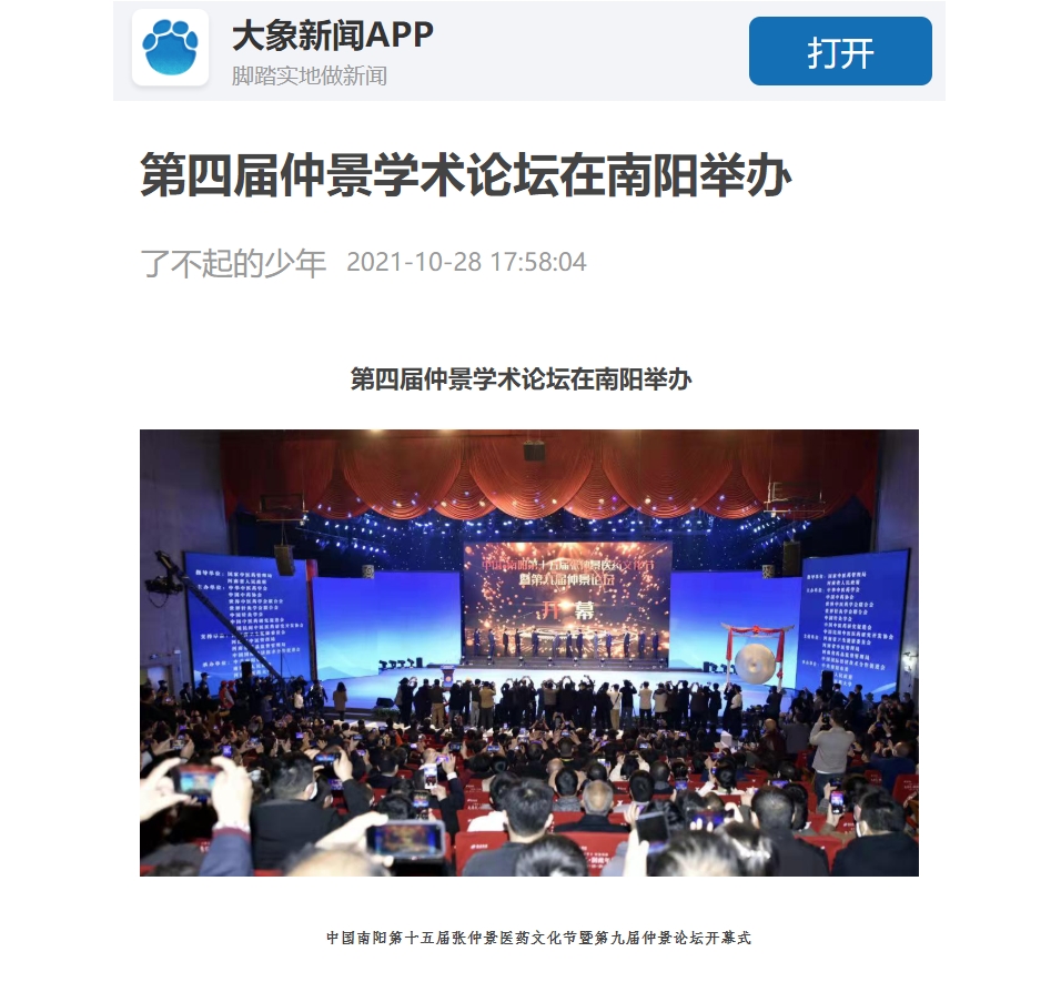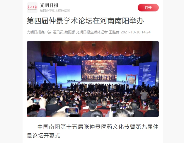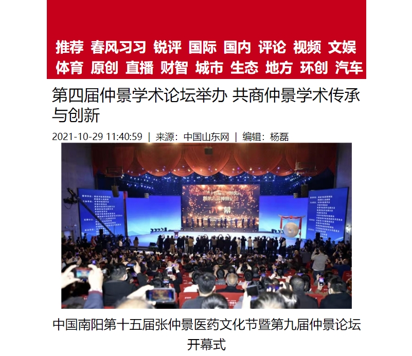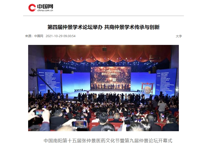 编者按:2021年10月28日-30日,光明日报客户端、中国网、国际在线、中国要闻网、中国教育热线、中国企业网、中国财经网、中国财经时报网、中国企业经济网、中国都市网、中国商业网、中国信息网、中国城市网、中国教育产业网、中国企业报道、中国焦点新闻网 、中国财经要闻、中国财经时报网、中国都市新闻网、中国法制网、中国社会新闻网、中华教育网、中国商业观察网、中国三农网、中国文化网、中国金融新闻网、中国企业新闻网、中国消费新闻网、中国市场网、中国教育品牌网、中华教育在线、中国教育论坛、中国基层网、大象新闻、中工网等百余家媒体对leyu·乐鱼(中国)体育官方网站举办的“世界中医药学会联合会仲景传承与创新专业委员会、中华中医药学会仲景学术传承与创新共同体2021年会暨第四届仲景学术论坛”进行报道。