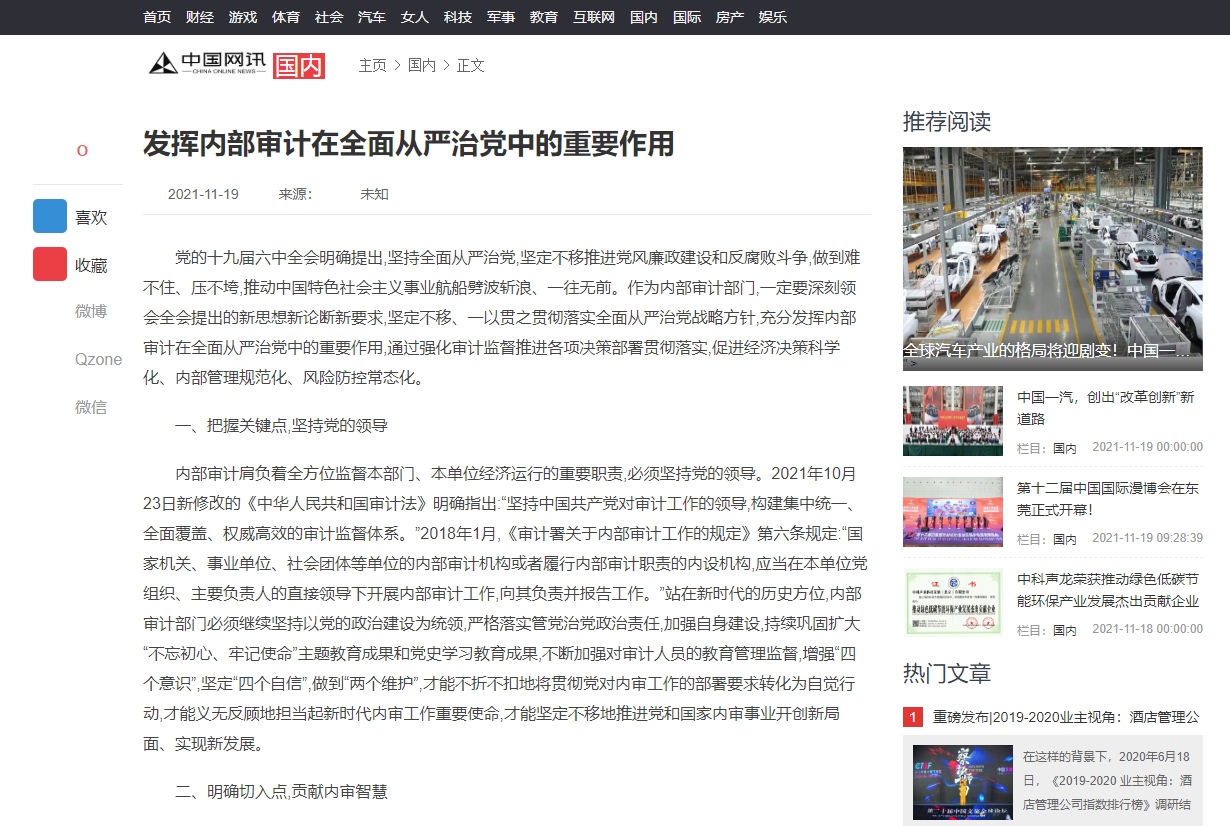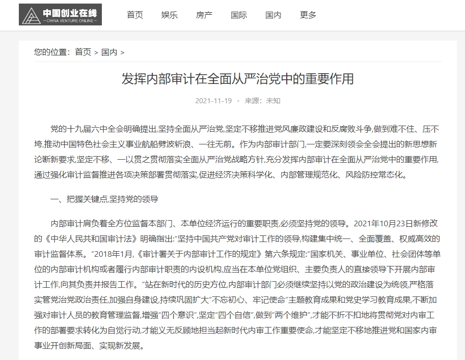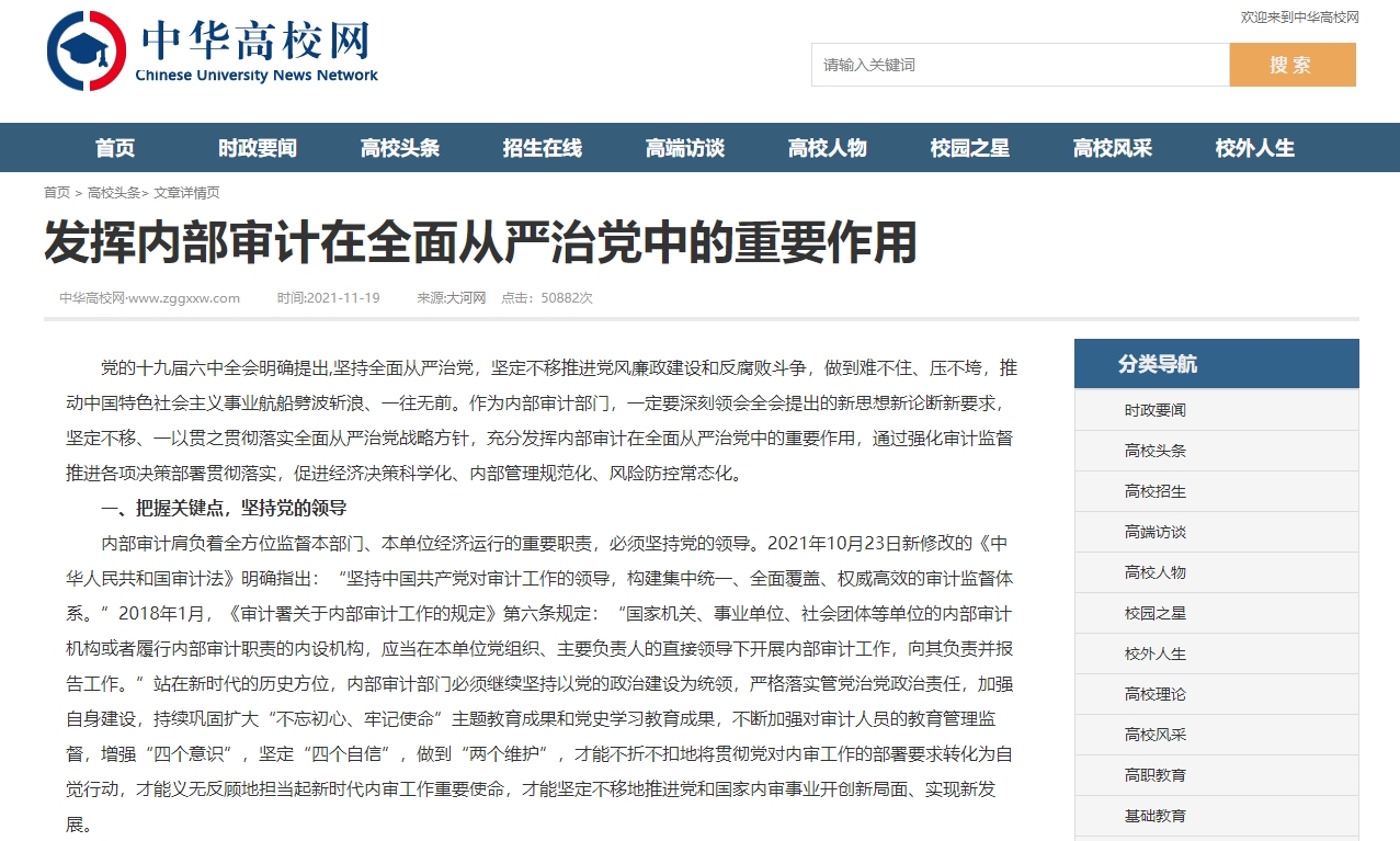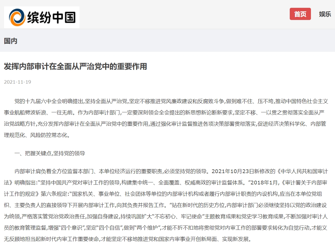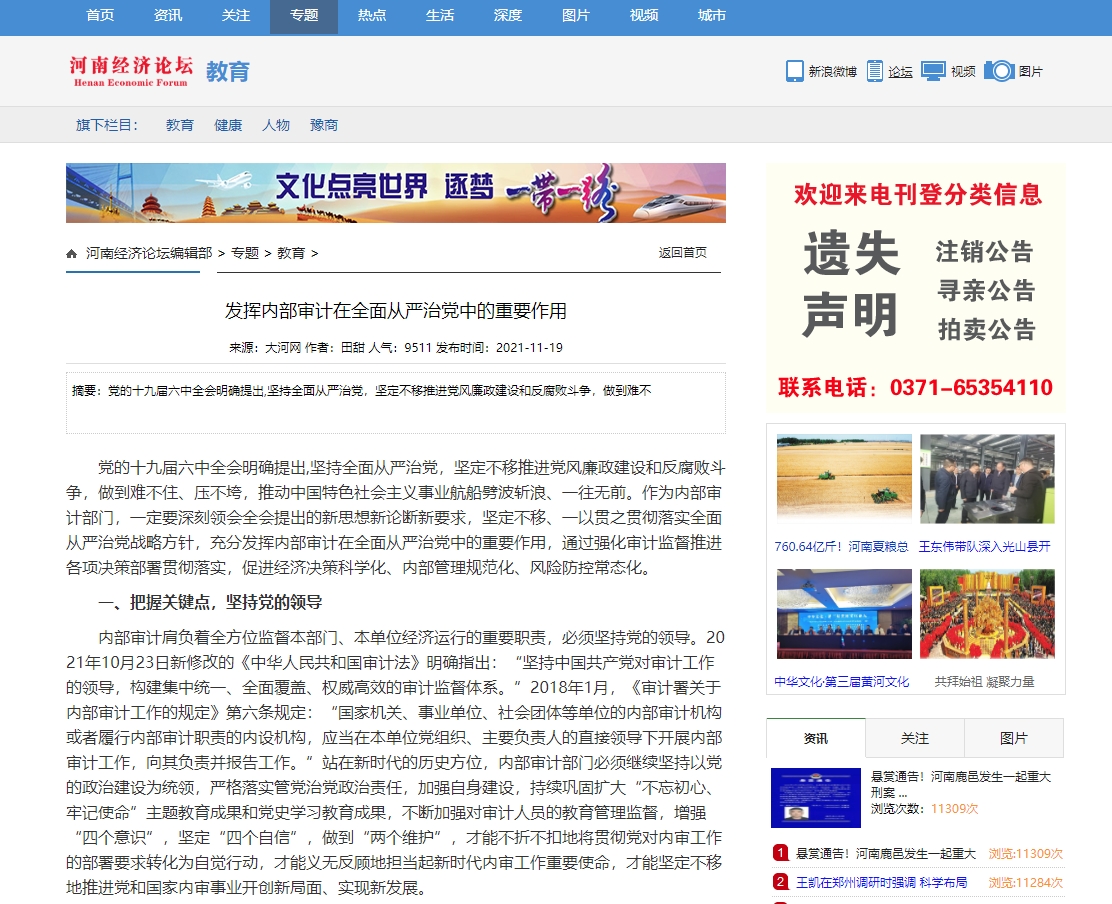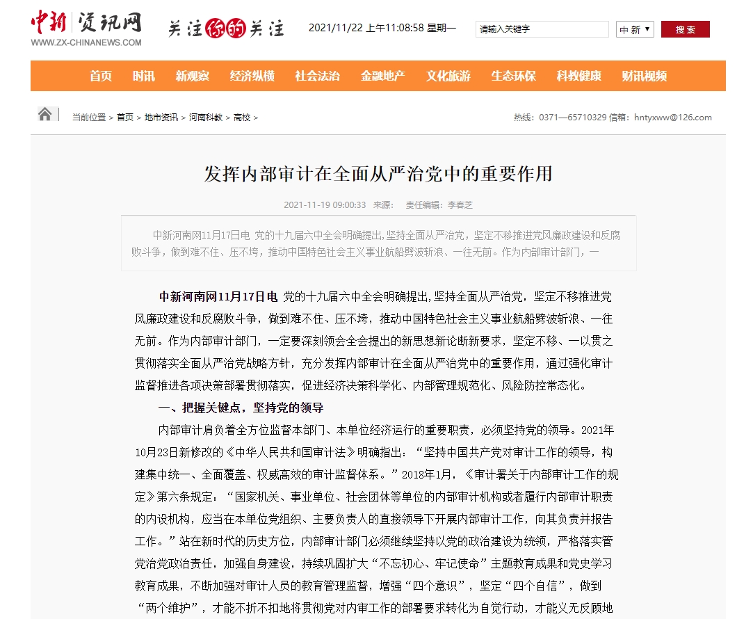 编者按:2021年11月19日,中华高校网、中新资讯网、中国报道网、中国网讯、中国侨报网、经典中国、创业中国、中国大观网、缤纷中国、中国创业在线、美丽中国报、中国梦网、新豫网、河南经济论坛等多家媒体刊发了leyu·乐鱼(中国)体育官方网站审计处处长高爽、孙睿敏老师的理论文章《发挥内部审计在全面从严治党中的重要作用》。