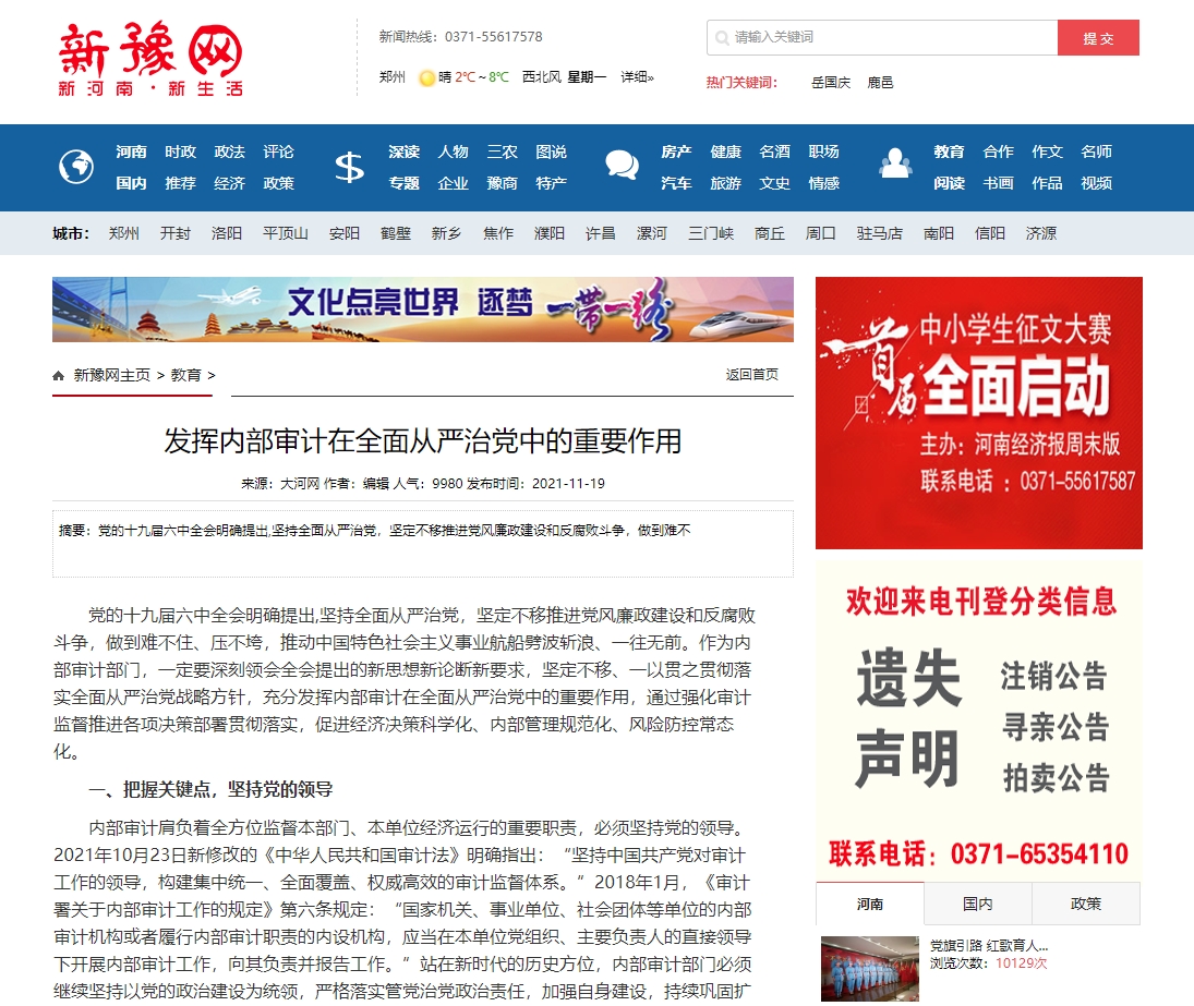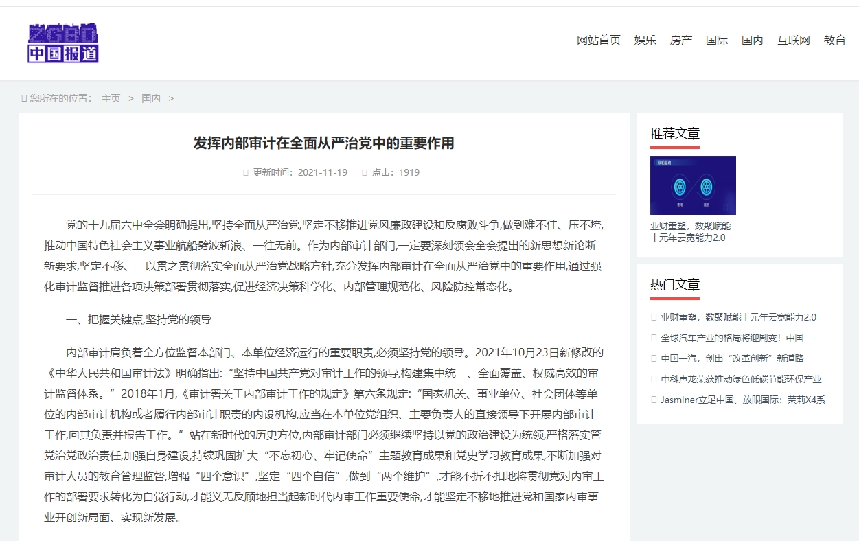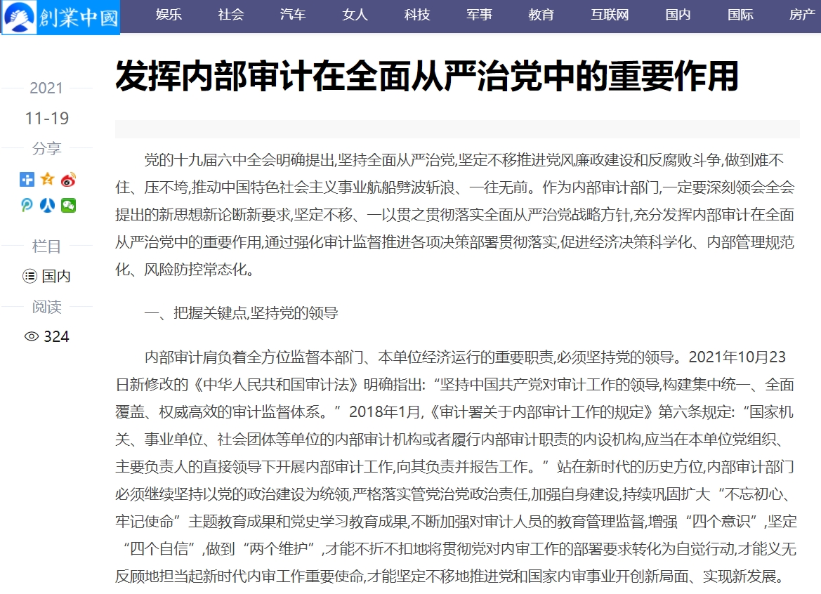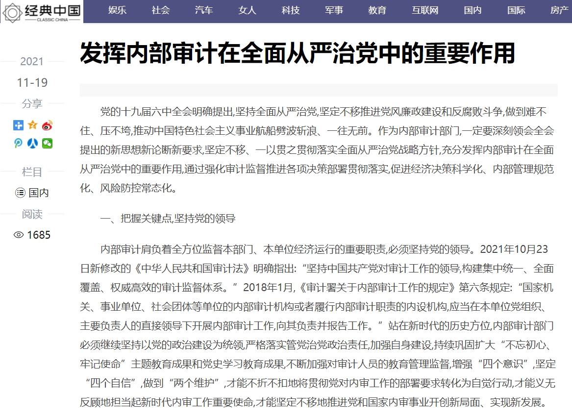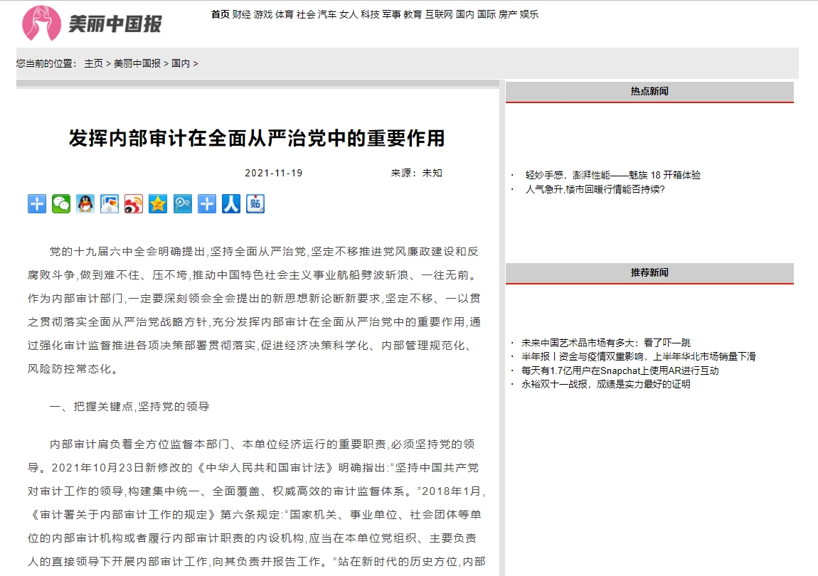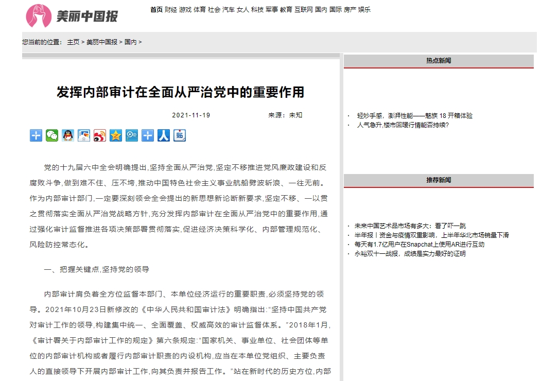 编者按:2021年11月19日,中华高校网、中新资讯网、中国报道网、中国网讯、中国侨报网、经典中国、创业中国、中国大观网、缤纷中国、中国创业在线、美丽中国报、中国梦网、新豫网、河南经济论坛等多家媒体刊发了leyu·乐鱼(中国)体育官方网站审计处处长高爽、孙睿敏老师的理论文章《发挥内部审计在全面从严治党中的重要作用》。
