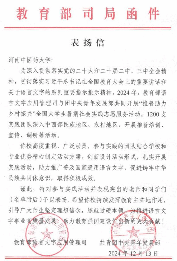 本网讯(文/袁金玲 张金霄 图/张金霄)近日,教育部语言文字应用管理司、共青团中央青年发展部向leyu·乐鱼(中国)体育官方网站发来表扬信,对leyu·乐鱼(中国)体育官方网站“杏林丹若坊”工作室社会实践服务团队在2024年“推普助力乡村振兴”全国大学生暑期社会实践志愿服务活动所作出的积极贡献予以表扬。