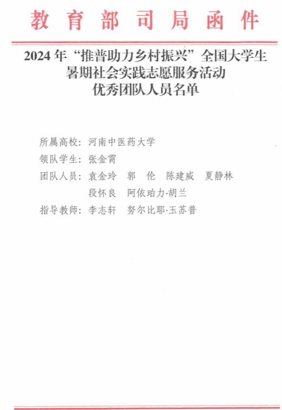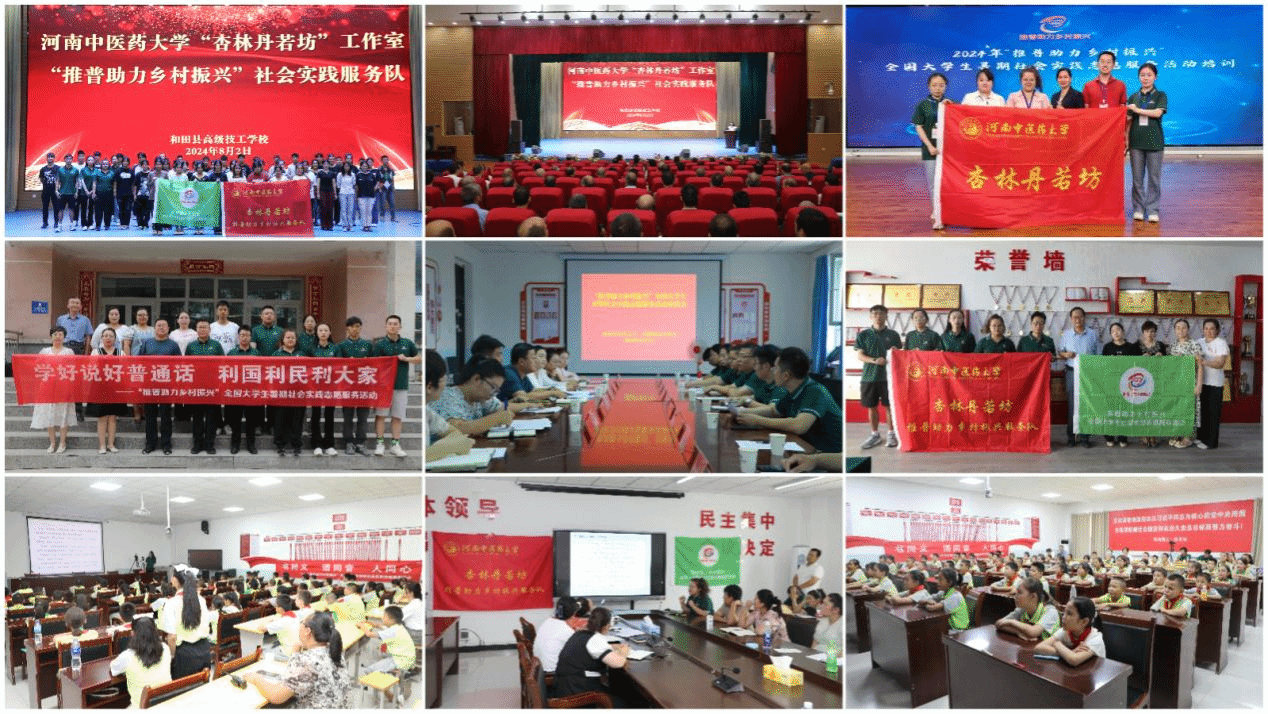 为深入贯彻落实党的二十大和二十届二中、三中全会精神,贯彻落实习近平总书记在全国教育大会上的重要讲话和关于语言文字的系列重要指示批示精神,2024年,教育部语言文字应用管理司与团中央青年发展部共同开展“推普助力乡村振兴”全国大学生暑期社会实践志愿服务活动。“杏林丹若坊”工作室团队成员深入新疆和田地区和田市、和田县、洛浦县及昌吉州玛纳斯县等地开展专项社会实践活动;实践以推广国家通用语言文字构筑沟通桥梁、以宣传弘扬中医药文化开展深层次交往交流,助力乡村振兴战略实施,服务铸牢中华民族共同体意识,推动当地语言文字工作、医疗健康事业及经济社会发展;活动受到中国教育电视台微信公众号、河南教育宣传网、河南高教媒体平台、玛纳斯县融媒体中心、洛浦县高级技工学校公众号等多家媒体报道,获得社会各界广泛关注与支持,实践团队从全国1200支团队中脱颖而出,荣获优秀团队。