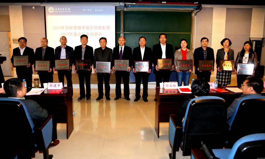 副院长郭德欣对2013年度的目标管理考核工作进行了回顾,并宣布了2013年目标管理考核评议结果及奖励办法。校领导为考核为A类的部门和单位颁发了“2013年度目标管理工作先进集体”奖牌(教务处、组织人事处、学科办;党院办、基建处、宣传统战部、离退休职工工作处;一附院、药学院、二附院;人文学院、思政部),为获得创新一等奖的部门和单位颁发了证书。