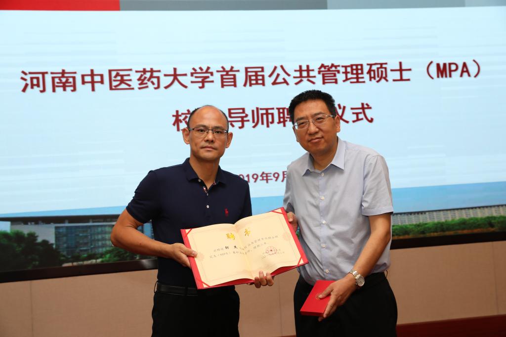 别荣海还向到会的校外实践导师代表河南省人民医院党委副书记武素英、河南日报报业集团河南手机报总编辑刘静沙、河南省卫生计生监督局副局长孙磊、河南省卫生健康委员会法规处副处长邹杰、河南省卫生健康委员会体制改革处副处长高远、解放军联勤保障部队第988医院空勤科主任曹小勇及河南省政府相关部门的导师颁发了聘任证书,并赠送了校徽。
