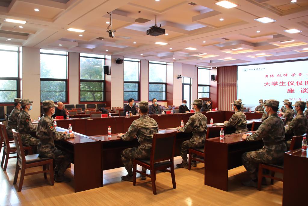 本网讯(文/范凯 图/高展)为贯彻落实立德树人根本任务和“三全育人”思想,进一步加强学生思想政治工作,更好地发挥leyu·乐鱼(中国)体育官方网站大学生仪仗队、教导队在提高学生思想政治、素质教育、规范管理、学风建设、国防教育等方面起到的积极作用,校武装保卫处于2021年11月9日下午3:00在图书馆第二报告厅成功举办了“大学生仪仗队、教导队座谈会”。校党委副书记、工会主席张小平、校党委宣传部部长刘金厂、校学工部部长李俊芝、校团委副书记黄怡博出席了会议。会议由校武装部副部长范凯主持,校仪仗队、教导队20余名学生参加了座谈。