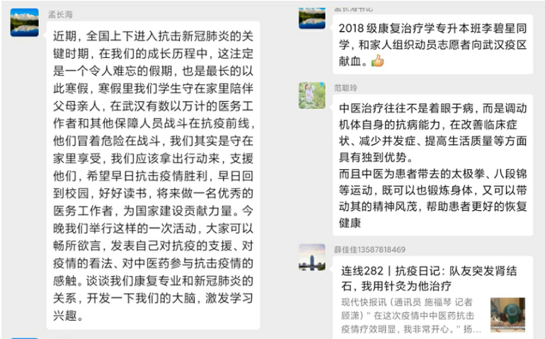 通过本次在线讨论活动,康复医学院的师生们围绕疫情防控发表看法,声援抗疫,表达了抗疫必胜的信念,同时紧密结合当前中医药参与抗疫取得的成果,激发了学生学习中医药的兴趣,巩固专业思想。通过讨论,同学们对疫情防控工作更加有了坚定的信心,进一步明确了未来的职业规划,加深了认识中医、喜欢中医、学好中医康复的决心,以科学知识积极防护,以阳光心态相互鼓励,传播同舟共济的正能量,不断发展中医,促进中医与时俱进,相信很快就能打赢这场疫情防控阻击战!