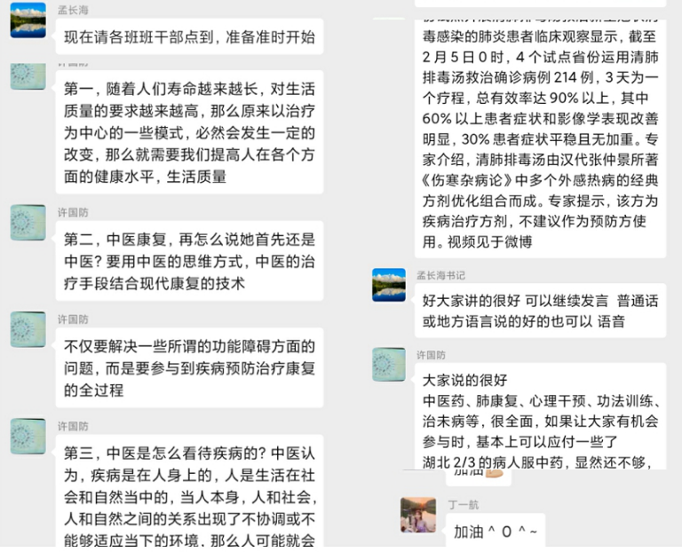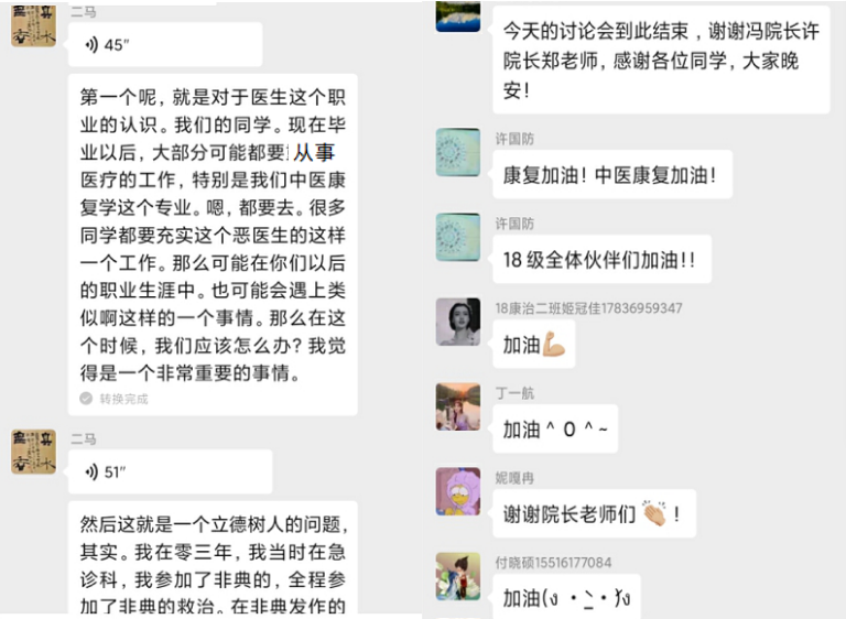 本网讯(文图/程雪 步家铭)面对新冠肺炎疫情的肆虐,为进一步落实leyu·乐鱼(中国)体育官方网站新冠肺炎疫情防控工作的方案和要求,做好学生方面疫情联防联控工作,康复医学院于2月21日19:30——21:00在2018级疫情防控工作群中举行了“声援抗疫新冠肺炎与康复医学”的讨论活动。康复医学院副院长冯晓东、党委副书记孟长海、副院长许国防和班主任郑婕、郭宇、程雪老师与2018级全体同学在线互动。