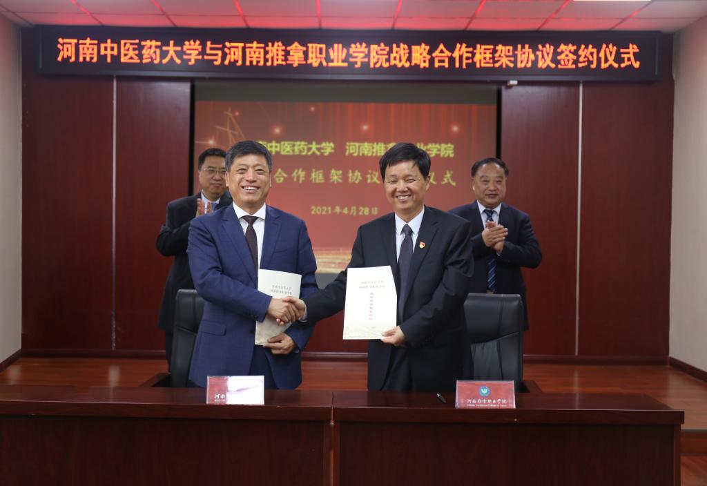 在双方校领导、部门单位负责同志和河南推拿职业学院师生代表的共同见证下,许二平、冯民生作为双方学校代表,签署了战略合作框架协议,并合影留念。