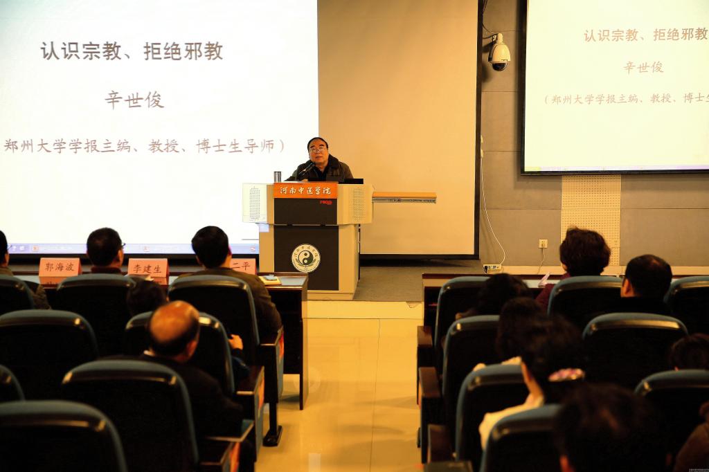 会上,辛世俊教授以《认识宗教、拒绝邪教》为题,从学理和现实出发,分五个方面对宗教和邪教作了细致阐述:一、宗教的本质和基本命题。辛教授从古今中外名家对宗教的解释出发,结合宗教的四个基本命题、五种社会属性等,详细阐释了马克思主义的宗教观。二、宗教的构成与社会功能。揭示了宗教的核心层、社会层和文化层三个不同层次,以及信仰、认识、慰藉等十大功能,并从宗教信仰的两个含义、宗教安慰人心的三个层面、宗教对个体的价值三方面着重对宗教的慰藉功能进行解释;三、宗教的发展与消亡。宗教属于历史的范畴,因此有产生、发展、消亡的规律;四、认识做好宗教工作的重要意义以及宗教和邪教的本质区别。最后,辛世俊教授从大学生认识和对待宗教问题的基本情况、大学生的信教原因、引导大学生正确认识和对待宗教问题三方面内容出发,呼吁与会者要正确认识宗教,拒绝邪教。