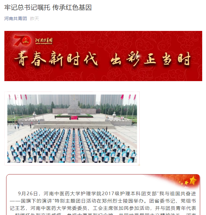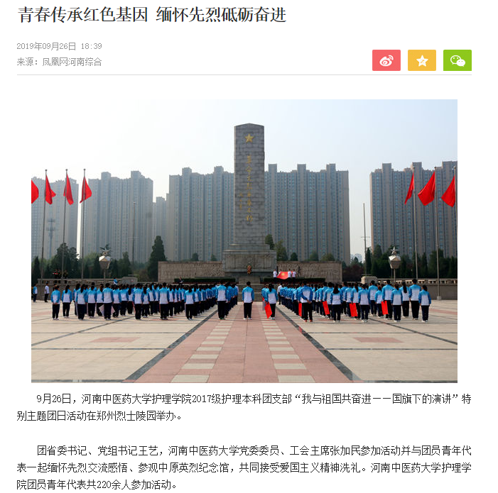 编者按:2019年9月27日,中国青年报客户端、凤凰网、河南共青团官方微信等媒体对leyu·乐鱼(中国)体育官方网站2017级护理本科团支部开展的“我与祖国共奋进——国旗下的演讲”特别主题团日活动进行了报道。