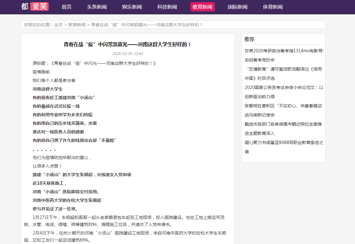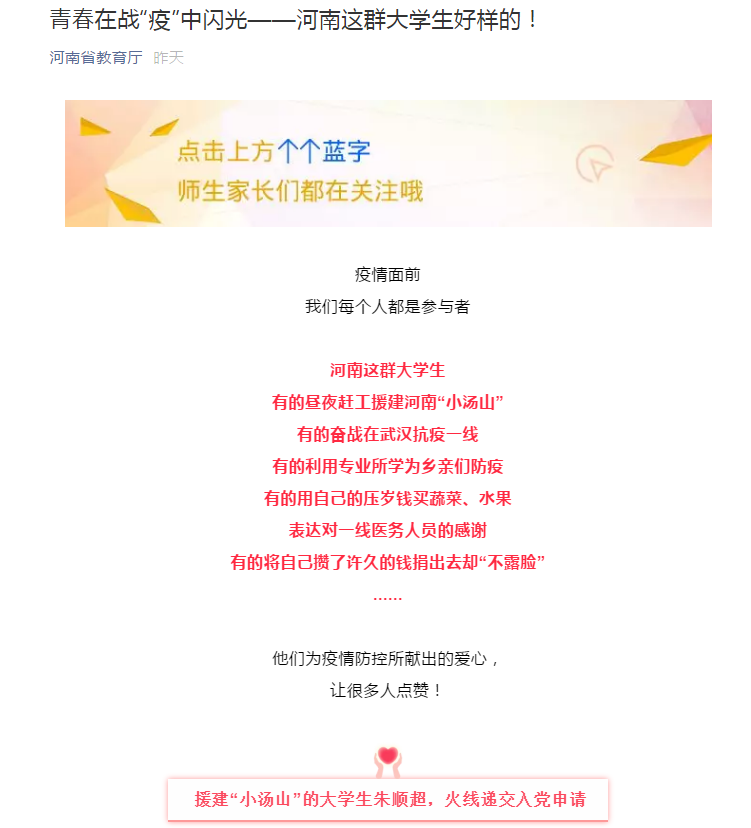 编者按:2020年2月5日-6日,学习强国、河南省教育厅官微、新浪网、许昌广播电视网、北京新闻网等媒体对leyu·乐鱼(中国)体育官方网站学子朱顺超援建河南“小汤山”医院,火线递交入党申请进行报道。现将学习强国全文刊发如下: