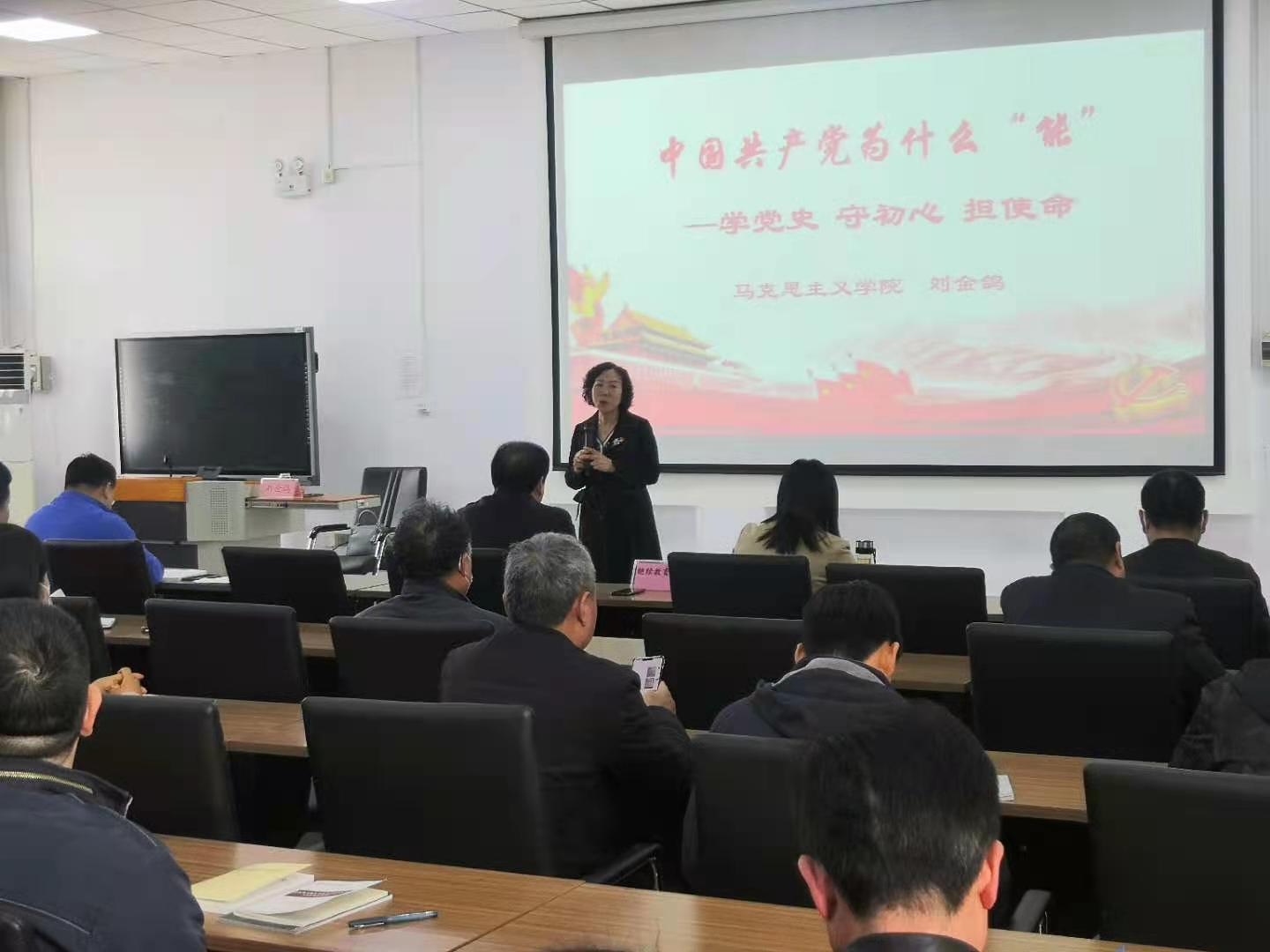本网讯(图文/王景辉)2021年4月6日下午,leyu·乐鱼(中国)体育官方网站马克思主义学院马克思主义中国化研究党支部书记刘金鸽教授在老校区图书馆4楼会议室,为继续教育学院、东明办、老干部处“学党史 守初心 担使命”培训班做《中国共产党为什么“能”》专题讲座。讲座由继续教育学院总支书记杨结实主持,来自三个部门的50多名党员、教师参加。